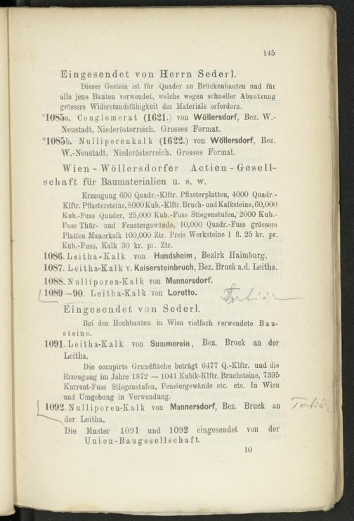 Die occupirte Grundfläche beträgt 6477 Q.-Klftr. und die Erzeugung im Jahre 1872 — 1041 Kubik-Klftr. Bruchsteine, 7395 Kurrent-Fuss Stiegenstufen, Fenstergewände etc. etc. In Wien und Umsrebuner in Verwendung.