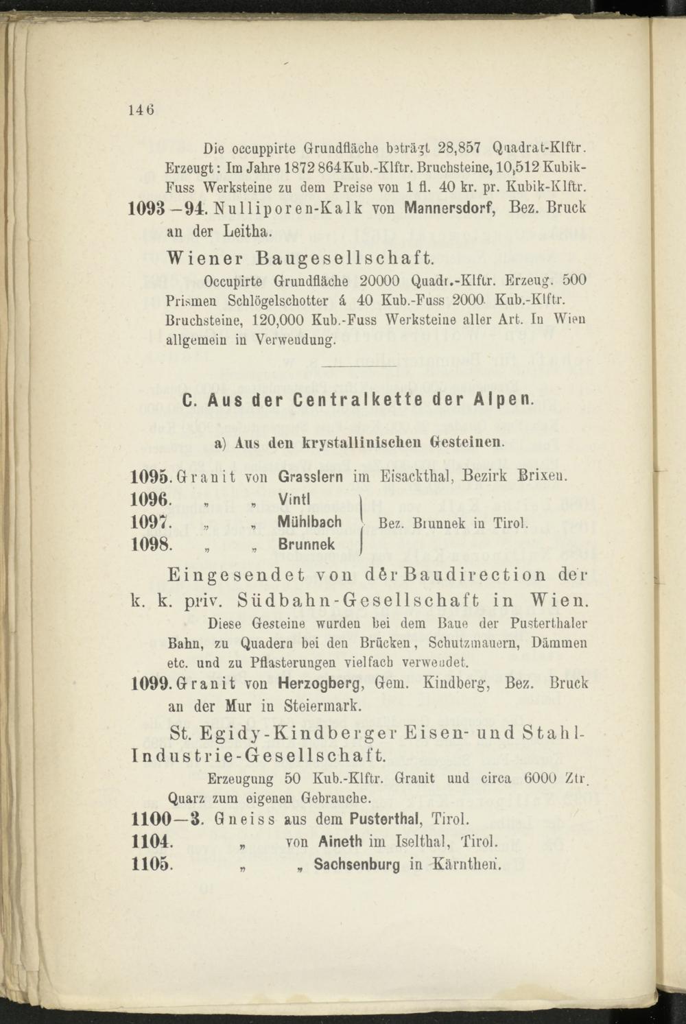 Die occuppirte Grundfläche beträgt 28,857 Qnadrat-Klftr. Erzeugt: Im Jahre 1872 864Kub.-Klftr. Bruchsteine, 10,512 Kubik- Fuss Werksteine zu dem Preise von 1 fl. 40 kr. pr. Kubik-Klftr. 1093 -94. Nulliporen-Kalk von Mannersdorf, Bez. Bruck an der Leitha.