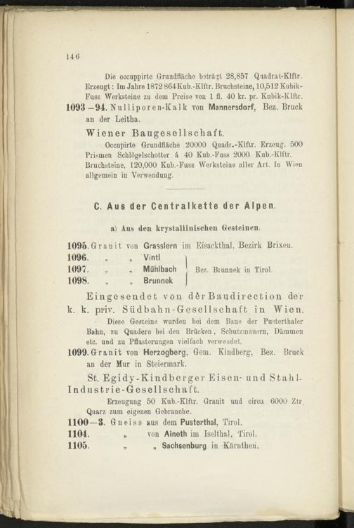 Occupirte Grundfläche 20000 Quadr,-Klfir. Erzeug. 500 Prismen Schlögelschotter ä 40 Kub.-Fuss 2000. Kub.-Klftr. Bruchsteine, 120,000 Kub.-Fuss Werksteine aller Art. In Wien allgemein in Verwendung.