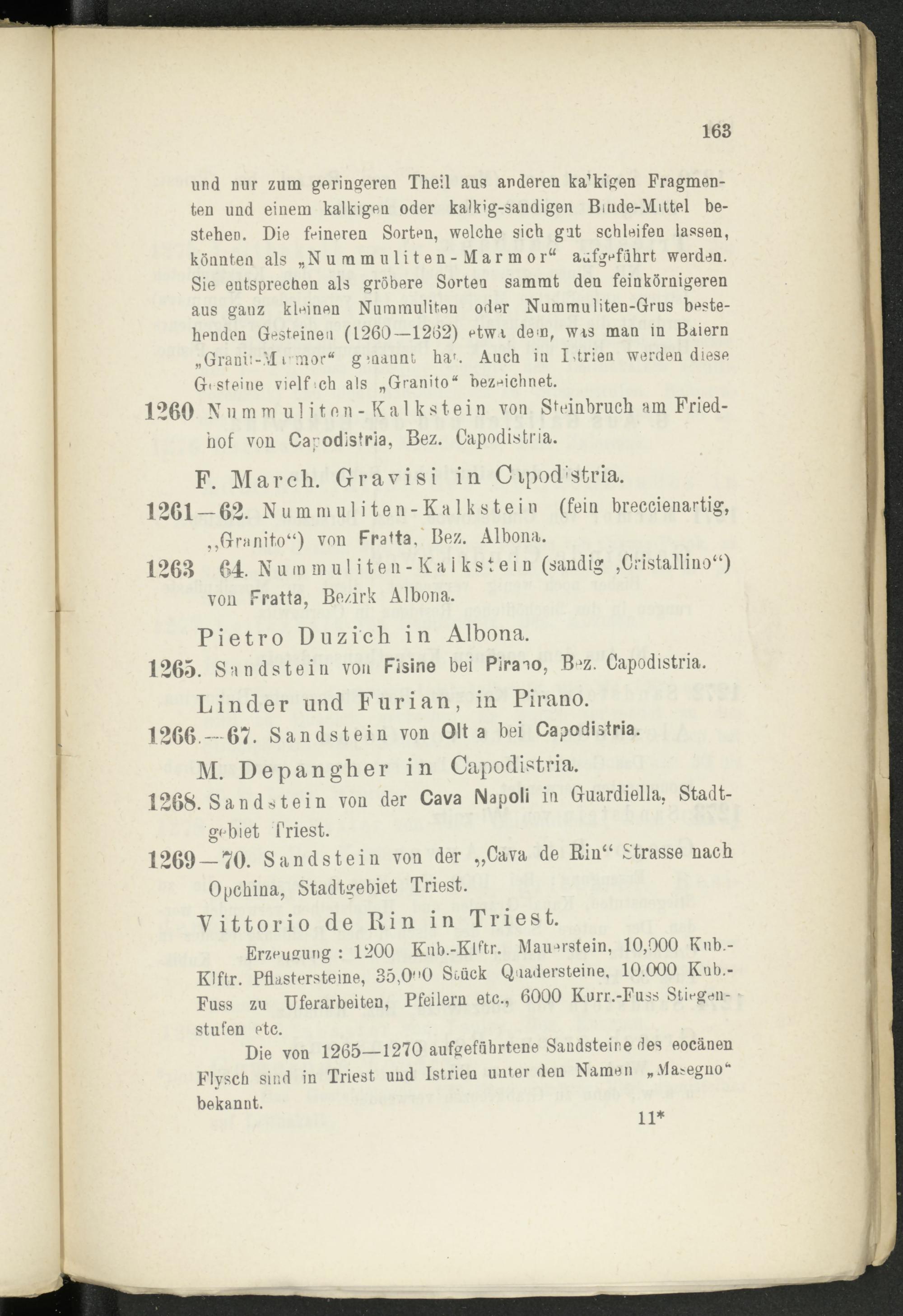 und nur zum geringeren Theil aus anderen käsigen Fragmenten und einem kalkigen oder kalkig-sandigen Binde-Mattel bestehen. Die feineren Sorten, welche sich gut schleifen lassen, könnten als „Nuramuliten-Marmor“ aüfgefjhrt werden. Sie entsprechen als gröbere Sorten sammt den feinkörnigeren aus ganz kleinen Nummuliten oder Nuramuliten-Grus bestehenden Gesteinen (1260—1262) etwa dem, wts man in Baiern „Granit-Mi-mor" gmaunt ha f . Auch iu Idrien werden diese Gt steine vielf>.ch als „Granito“ bezeichnet.