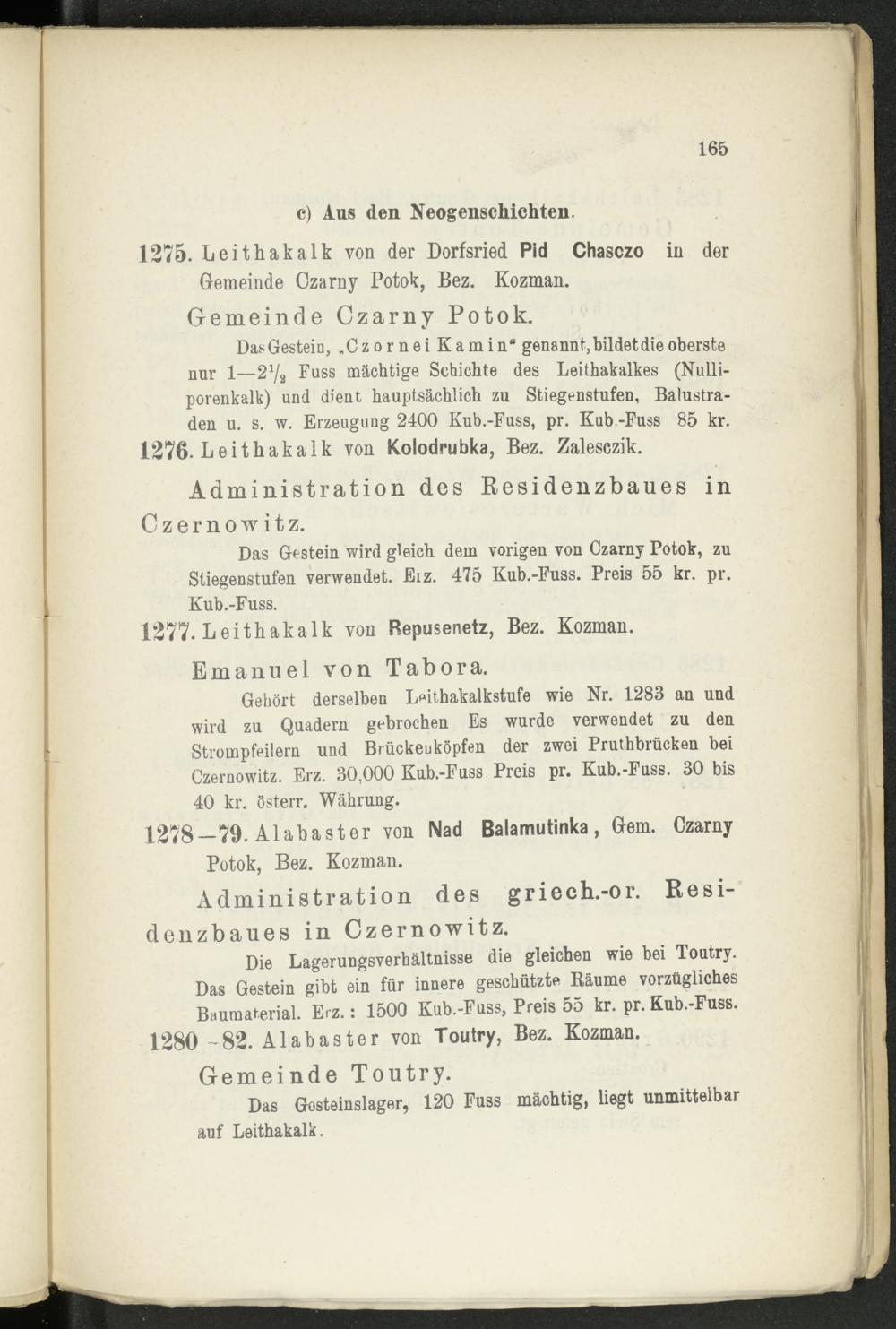 Gehört derselben Leithakalkstufe wie Nr. 1283 an und wird zu Quadern gebrochen Es wurde verwendet zu den Strompfeilern und Brückeuköpfen der zwei Pruthbrücken bei Czernowitz. Erz. 30,000 Kub.-Fuss Preis pr. Kub.-Fuss. 30 bis 40 kr. österr. Währung.