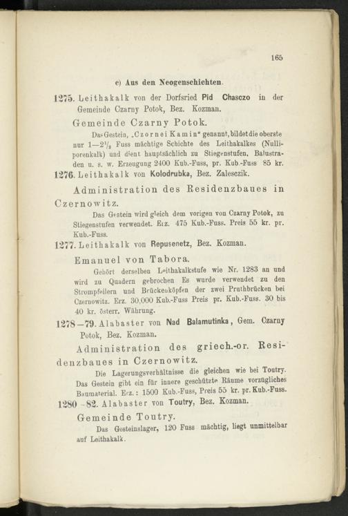 Die Lagerungsverbältnisse die gleichen wie bei Toutry. Das Gestein gibt ein für innere geschützte Räume vorzügliches Baumaterial. Erz.: 1500 Kub.-Fuss, Preis 55 kr. pr. Kub.-Fuss. 1280 -82. Alabaster von Toutry, Bez. Kozman.