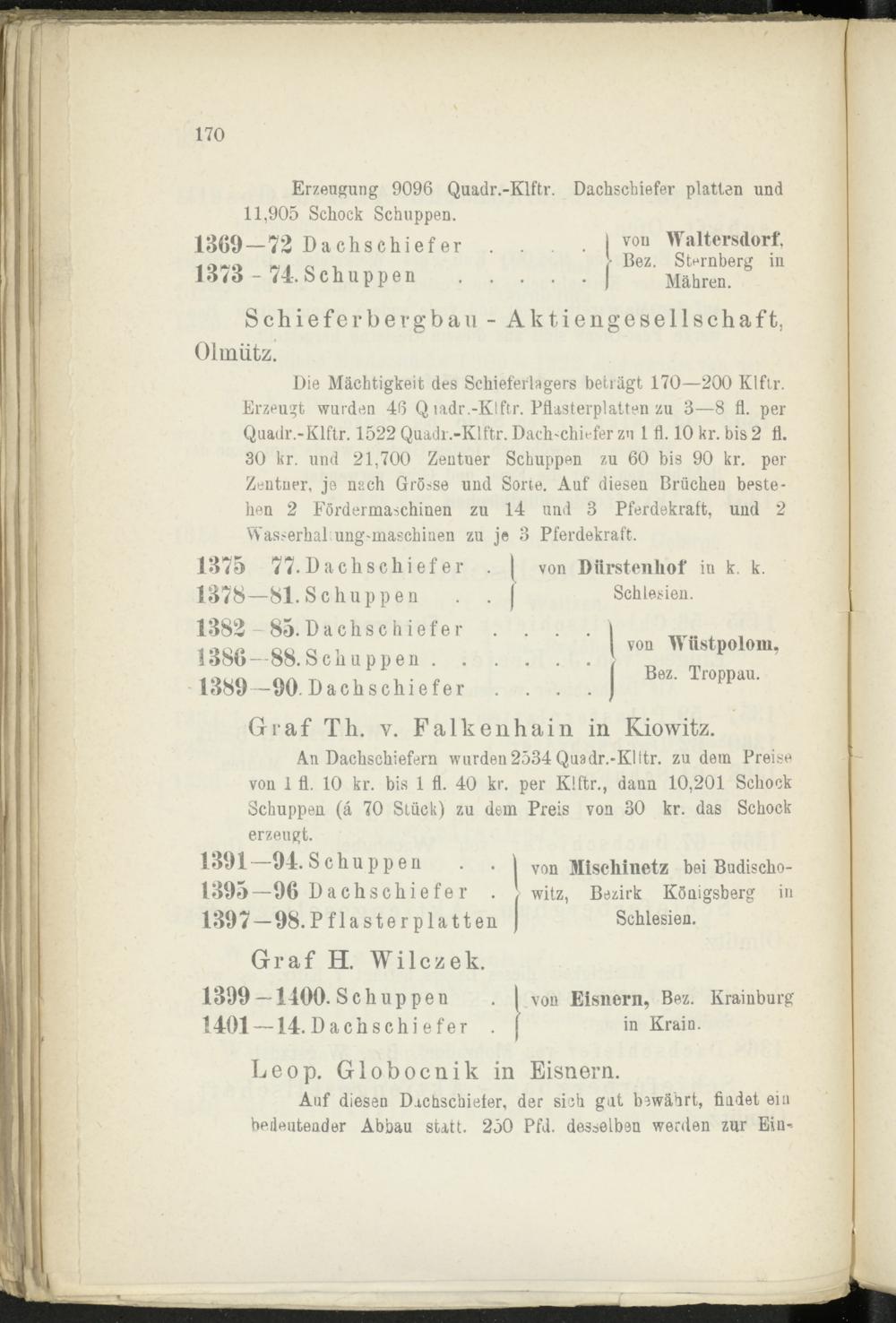 An Dachschiefern wurden 2534 Quadr.-Klttr. zu dein Preise von 1 fl. 10 kr. bis 1 fl. 40 kr. per Klftr., dann 10,201 Schock Schuppen (ä 70 Stück) zu dem Preis von 30 kr. das Schock erzeugt.