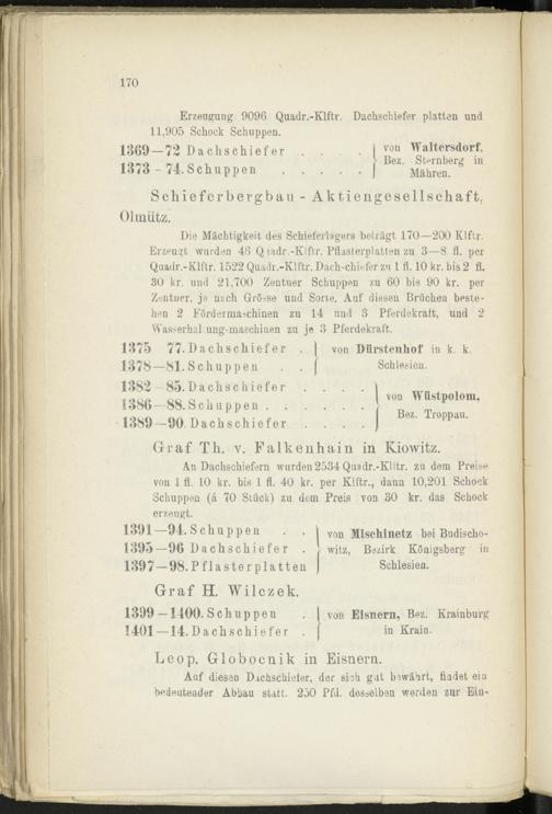Die Mächtigkeit des Schieferlagers beträgt 170—200 Klftr. Erzeugt wurden 46 Q ladr.-Klftr. Pflasterplatten zu 3—8 fl. per Quadr.-Klftr. 1522 Quadr.-Klftr. Dach'Chhfer zu 1 fl. 10 kr. bis 2 fl. 30 kr. und 21,700 Zentner Schuppen zu 60 bis 90 kr. per Zentner, je nach Grösse und Sorte. Auf diesen Brüchen bestehen 2 Fördermaschinen zu 14 und 3 Pferdekraft, und 2 Was^erhal ung-maschinen zu je 3 Pferdekraft.