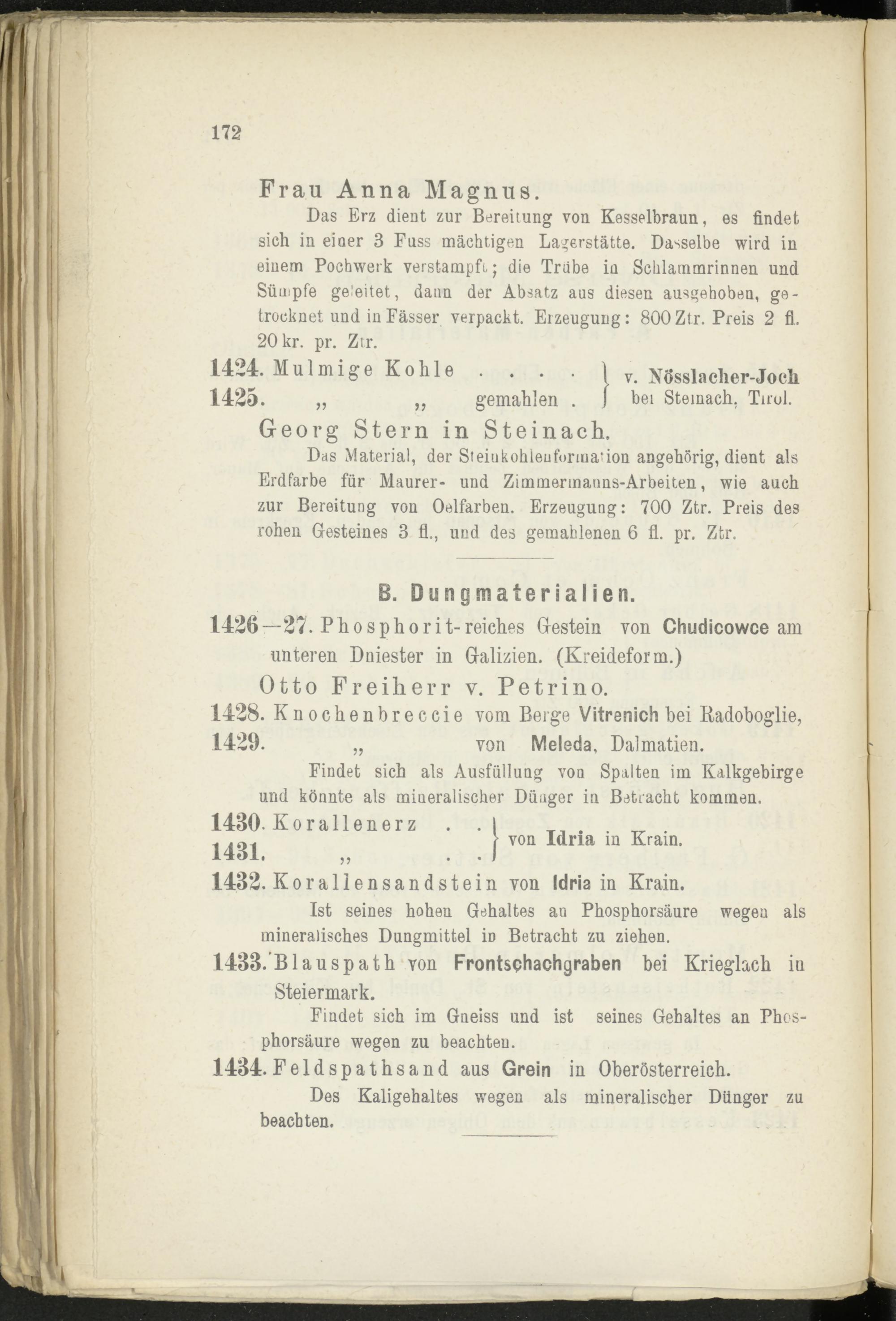 Das Erz dient zur Bereitung von Kesselbraun, es findet sich in eiaer 3 Fuss mächtigen Lagerstätte. Dasselbe wird in einem Pochwerk verstampfi; die Trabe ia Schlammrinnen und Sümpfe geleitet, dann der Absatz aus diesen ausgehoben, getrocknet und in Fässer verpackt. Erzeugung: 800 Ztr. Preis 2 fl. 20 kr. pr. Ztr.