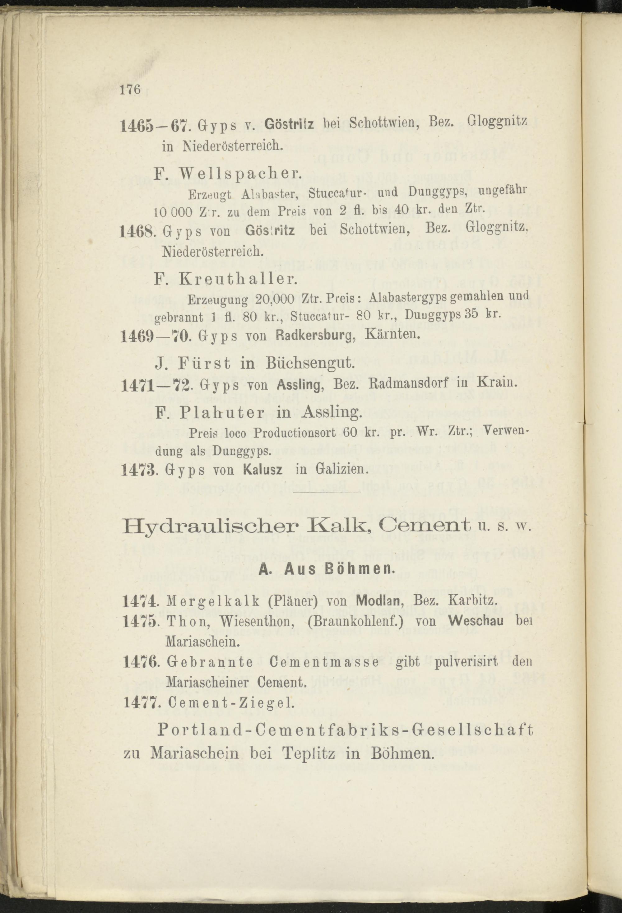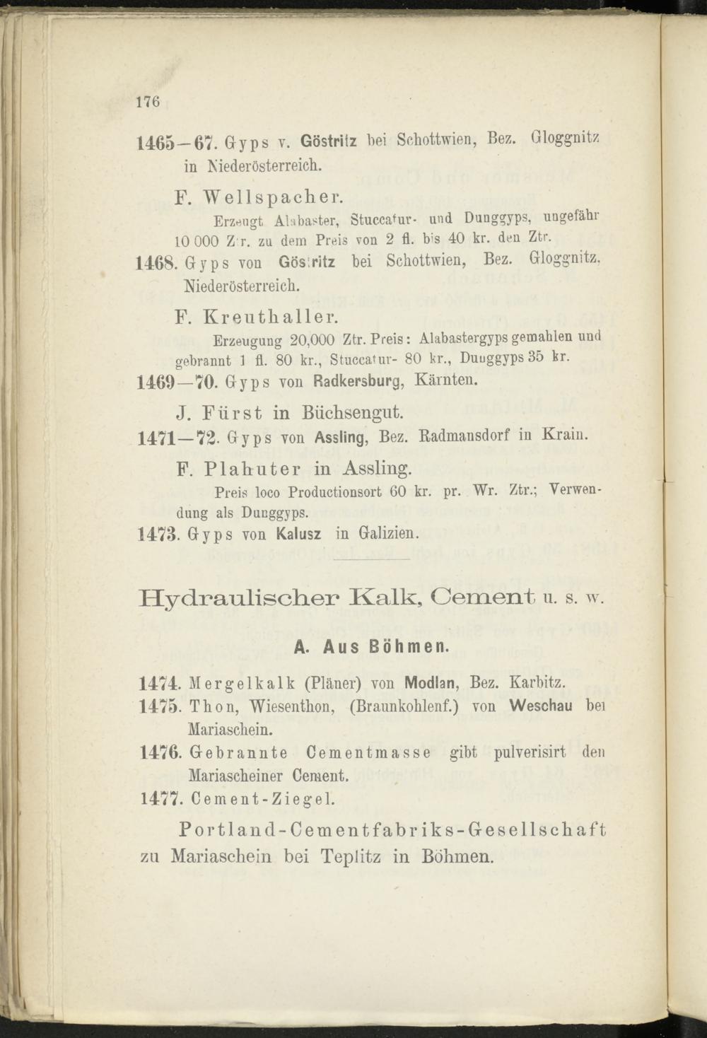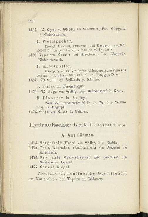 Erzeugung 20,000 Ztr. Preis: Alabastergyps gemahlen und gebrannt 1 fl. 80 kr., Stuccatur- 80 kr., Duuggyps 35 kr. 1469—70. Gyps von Radkersburg, Kärnten.