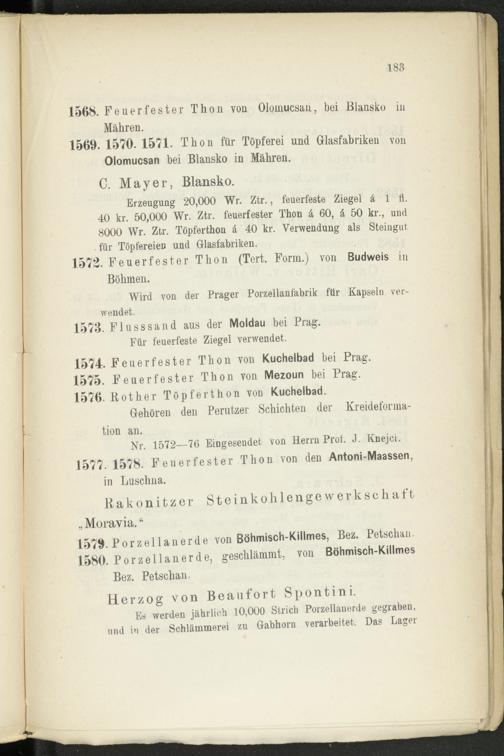 Erzeugung 20,000 Wr. Ztr., feuerfeste Ziegel ä 1 fl. 40 kr. 50,000 Wr. Ztr. feuerfester Thon ä 60, ä 50 kr., und 8000 Wr. Ztr. Töpferthon ä 40 kr. Verwendung als Steingut . für Töpfereien und Glasfabriken.