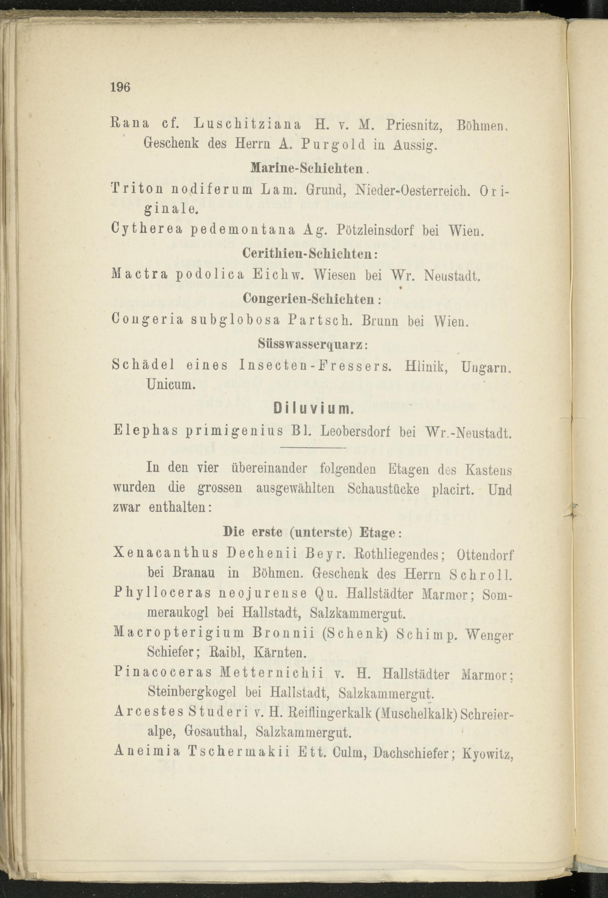 Xenacanthus Dechenii Beyr. Rothliegendes; Ottendorf hei Branau in Böhmen. Geschenk des Herrn Schroll. Phylloceras neojurense Qu. Hallstädter Marmor; Sommeraukogl bei Hallstadt, Salz kammergut. Macropterigium Bronnii (Schenk) Schi mp. Wenger Schiefer; Raibl, Kärnten.