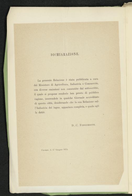 La presente Relazione è stata pubblicata a cura del Ministero di Agricoltura, Industria e Commercio, con diverse omissioni non consentite dal sottoscritto, il quale si propone renderle ben presto di pubblica ragione, inserendole in qualche Giornale accreditato di questa città, desiderando che la sua Relazione sull’Industria del legno, apparisca completa, e quale egli la dettò.