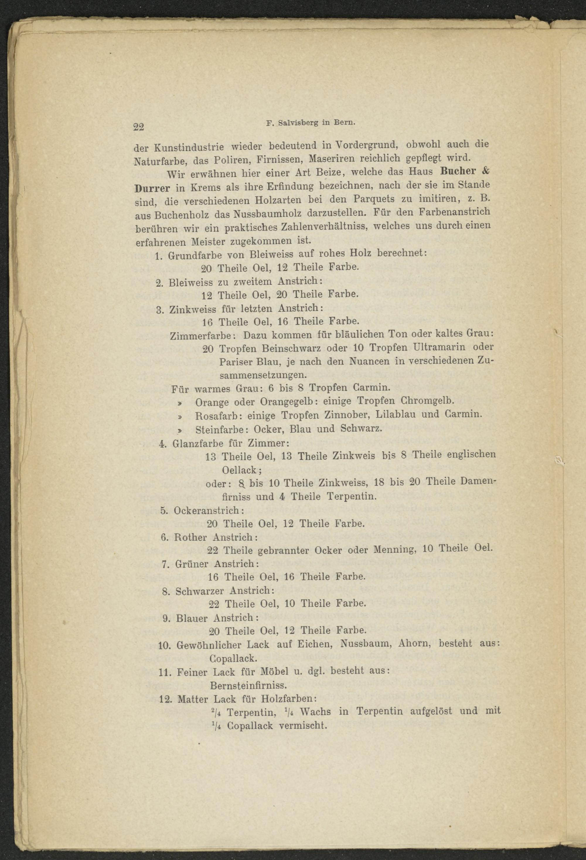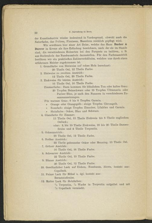 Wir erwähnen hier einer Art Beize, welche das Haus Bücher & Dürrer in Krems als ihre Erfindung bezeichnen, nach der sie im Stande sind, die verschiedenen Holzarten bei den Parquets zu imitiren, z. B. aus Buchenholz das Nussbaumholz darzustellen. Für den Farbenanstrich berühren wir ein praktisches Zahlenverhältniss, welches uns durch einen erfahrenen Meister zugekommen ist.