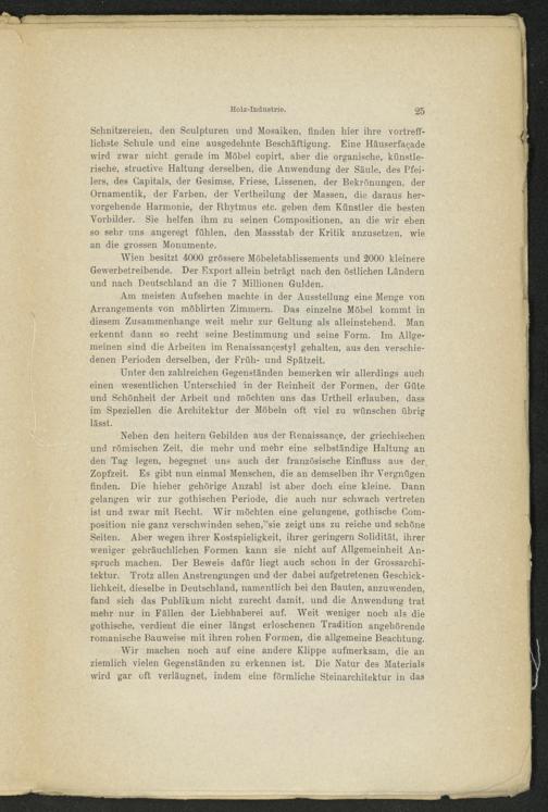 Unter den zahlreichen Gegenständen bemerken wir allerdings auch einen wesentlichen Unterschied in der Reinheit der Formen, der Güte und Schönheit der Arbeit und möchten uns das Urtheil erlauben, dass im Speziellen die Architektur der Möbeln oft viel zu wünschen übrig lässt.