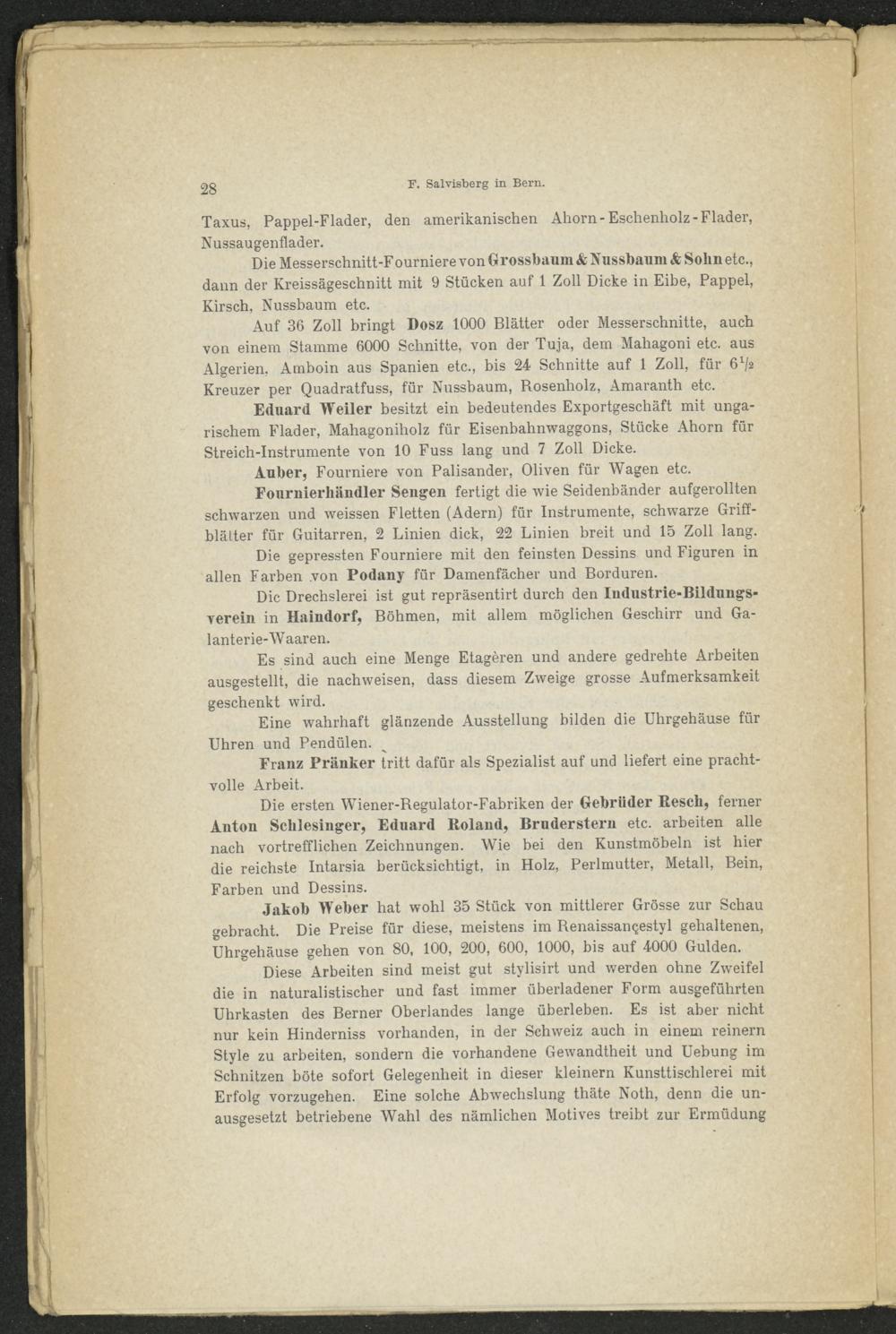 Eduard Weiler besitzt ein bedeutendes Exportgeschäft mit ungarischem Flader, Mahagoniholz für Eisenbahnwaggons, Stücke Ahorn für Streich-Instrumente von 10 Fuss lang und 7 Zoll Dicke.