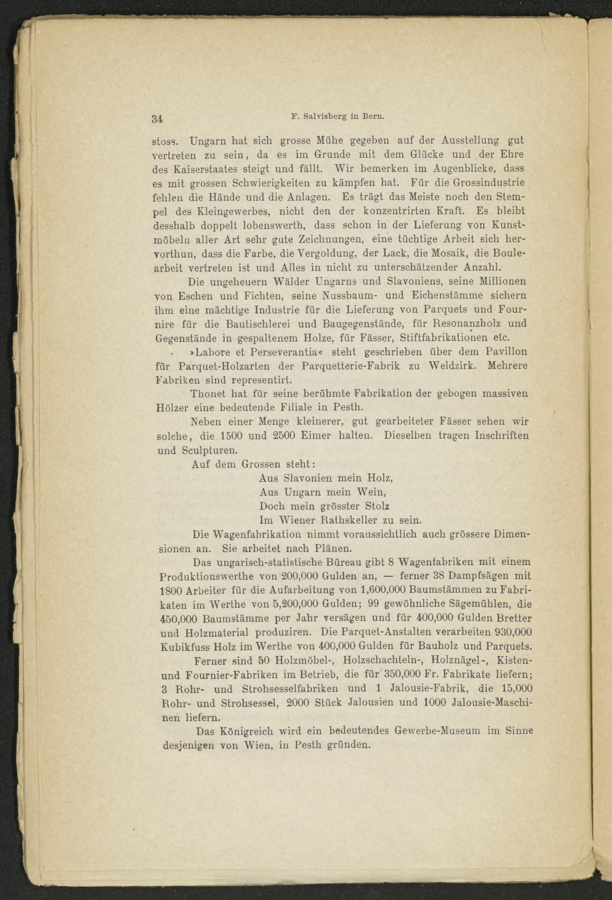 Die Ungeheuern Wälder Ungarns und Slavoniens, seine Millionen von Eschen und Fichten, seine Nussbaum- und Eichenstämme sichern ihm eine mächtige Industrie für die Lieferung von Parquets und Four- nire für die Bautischlerei und Baugegenstände, für Resonanzholz und Gegenstände in gespaltenem Holze, für Fässer, Stiftfabrikationen etc.
