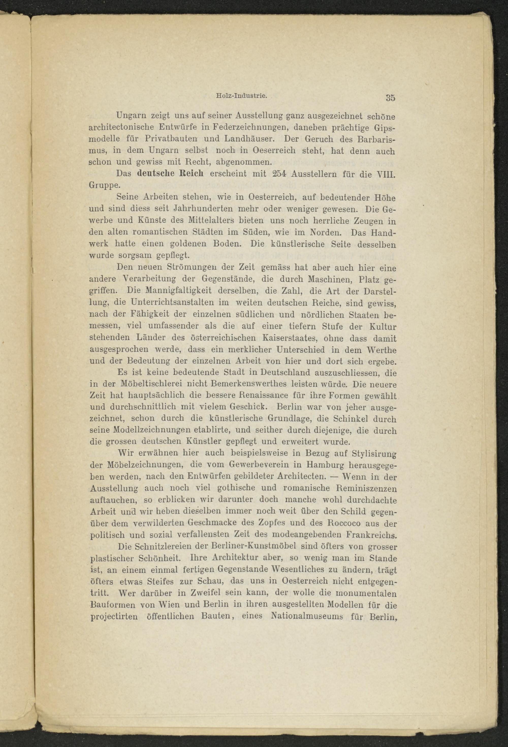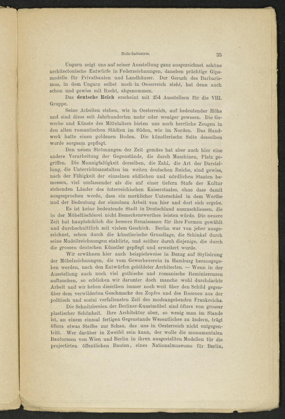 Den neuen Strömungen der Zeit gemäss hat aber auch hier eine andere Verarbeitung der Gegenstände, die durch Maschinen, Platz gegriffen. Die Mannigfaltigkeit derselben, die Zahl, die Art der Darstellung, die Unterrichtsanstalten im weiten deutschen Reiche, sind gewiss, nach der Fähigkeit der einzelnen südlichen und nördlichen Staaten bemessen, viel umfassender als die auf einer tiefem Stufe der Kultur stehenden Länder des österreichischen Kaiserstaates, ohne dass damit ausgesprochen werde, dass ein merklicher Unterschied in dem Werthe und der Bedeutung der einzelnen Arbeit von hier und dort sich ergebe.