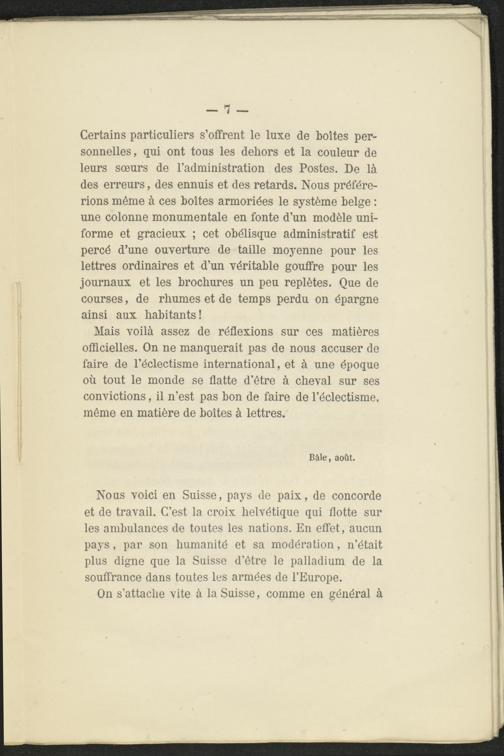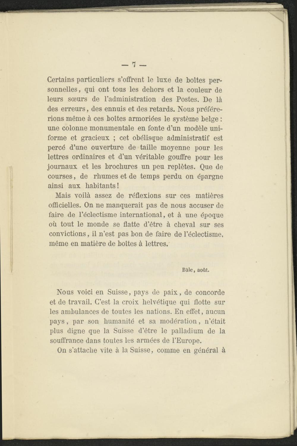 Nous voici en Suisse, pays de paix, de concorde et de travail. C’est la croix helvétique qui flotte sur les ambulances de toutes les nations. En effet, aucun pays, par son humanité et sa modération, n’était plus digne que la Suisse d’être le palladium de la souffrance dans toutes les armées de l’Europe.