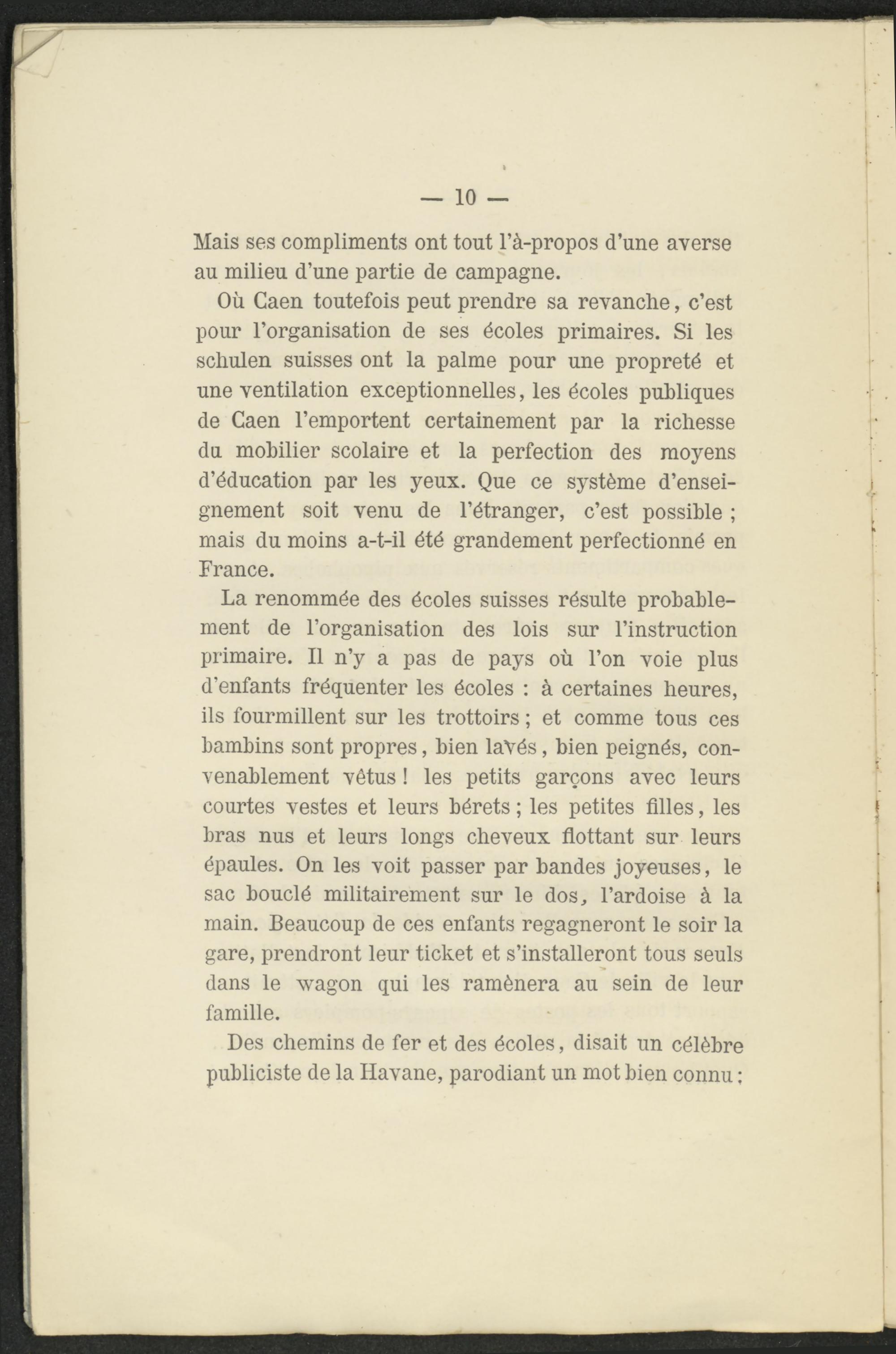 Où Caen toutefois peut prendre sa revanche, c’est pour l’organisation de ses écoles primaires. Si les schulen suisses ont la palme pour une propreté et une ventilation exceptionnelles, les écoles publiques de Caen l’emportent certainement par la richesse du mobilier scolaire et la perfection des moyens d’éducation par les yeux. Que ce système d’enseignement soit venu de l’étranger, c’est possible ; mais du moins a-t-il été grandement perfectionné en France.