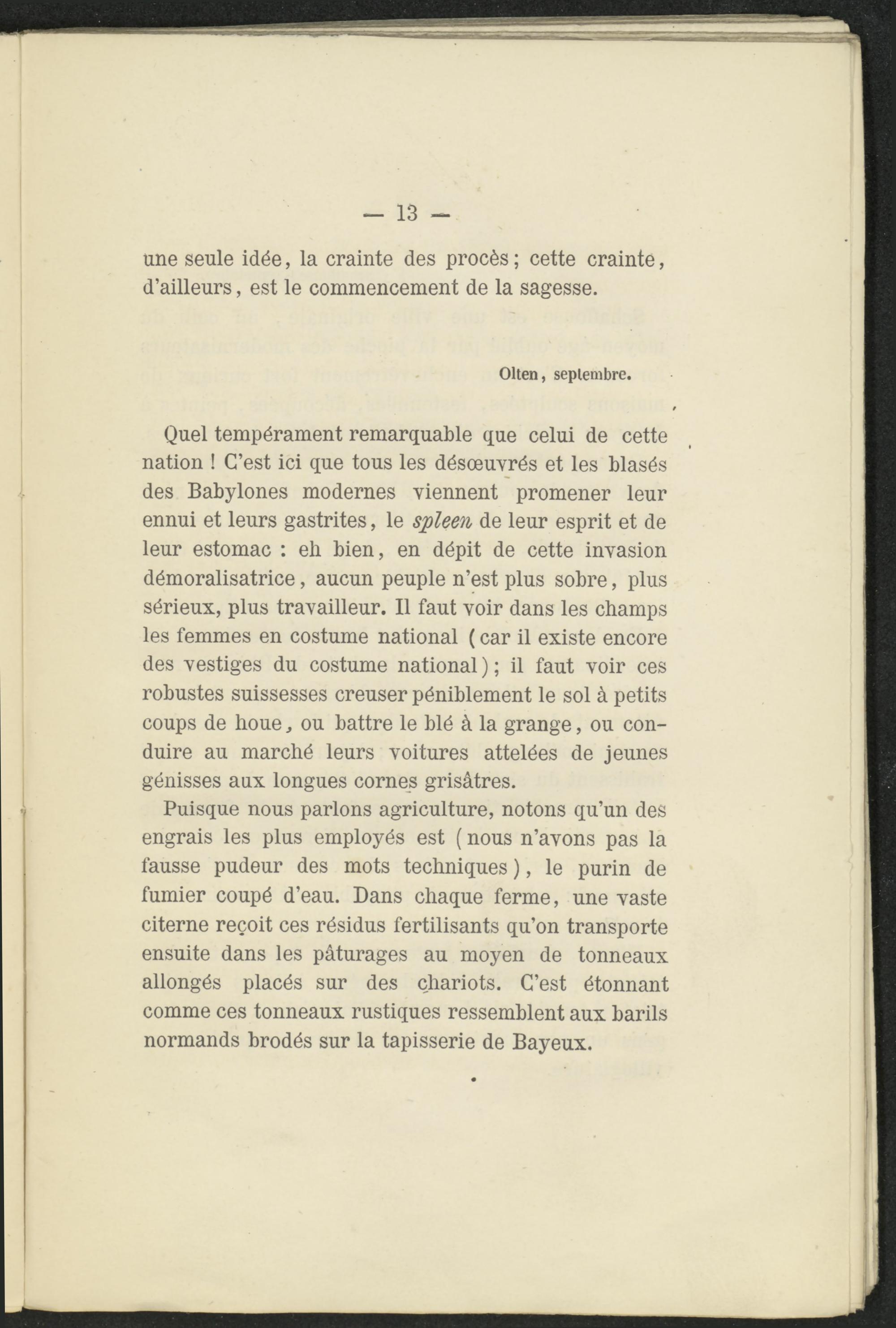 Quel tempérament remarquable que celui de cette nation ! C’est ici que tous les désoeuvrés et les blasés des Babylones modernes viennent promener leur ennui et leurs gastrites, le spleen de leur esprit et de leur estomac : eh bien, en dépit de cette invasion démoralisatrice, aucun peuple n’est plus sobre, plus sérieux, plus travailleur. Il faut voir dans les champs les femmes en costume national ( car il existe encore des vestiges du costume national ) ; il faut voir ces robustes Suissesses creuser péniblement le sol à petits coups de houe, ou battre le blé à la grange, ou conduire au marché leurs voitures attelées de jeunes génisses aux longues cornes grisâtres.