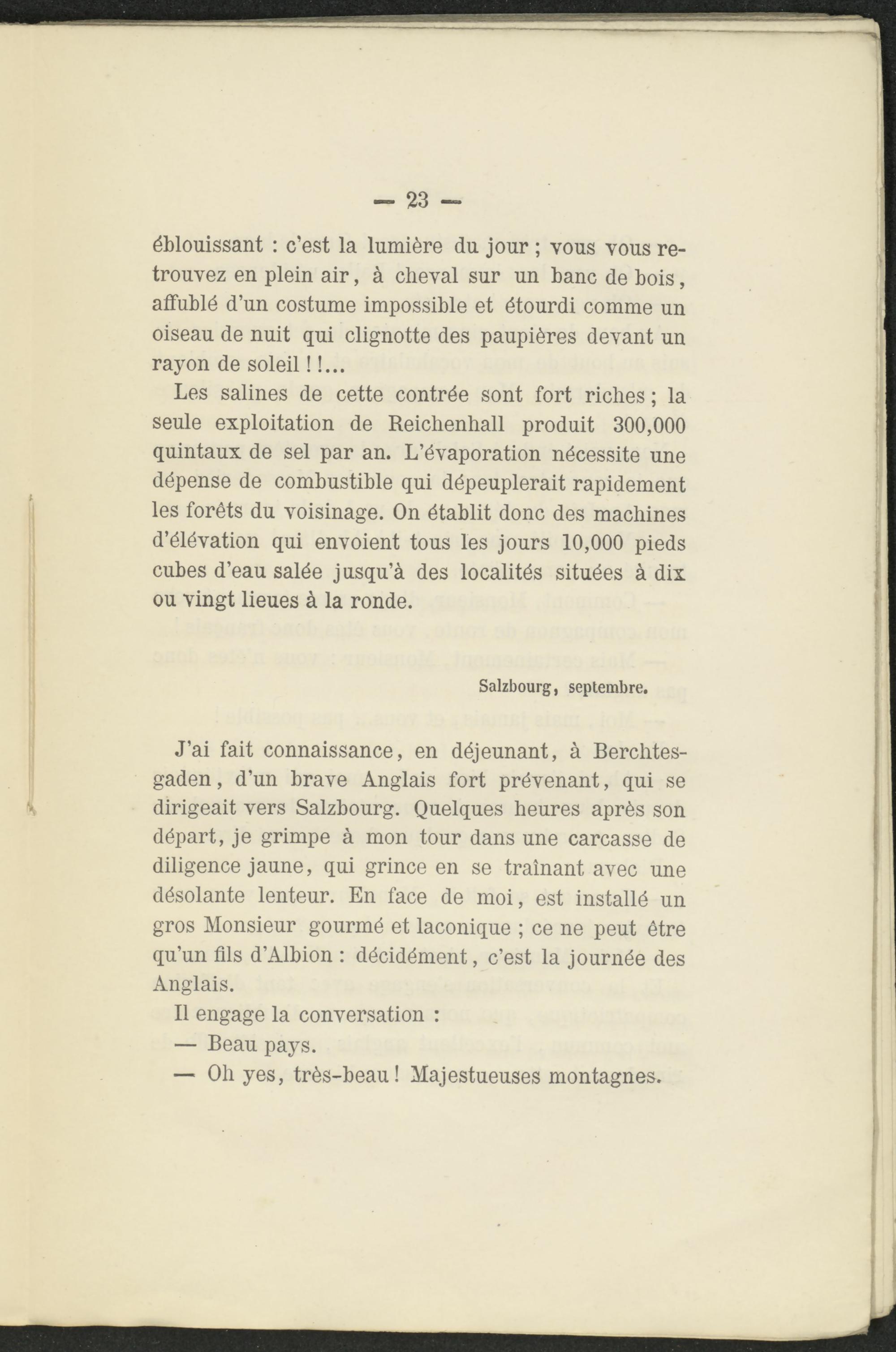 J’ai fait connaissance, en déjeunant, à Berchtes- gaden, d’un brave Anglais fort prévenant, qui se dirigeait vers Salzbourg. Quelques heures après son départ, je grimpe à mon tour dans une carcasse de diligence jaune, qui grince en se traînant avec une désolante lenteur. En face de moi, est installé un gros Monsieur gourmé et laconique ; ce ne peut être qu’un fils d’Albion : décidément, c’est la journée des Anglais.
