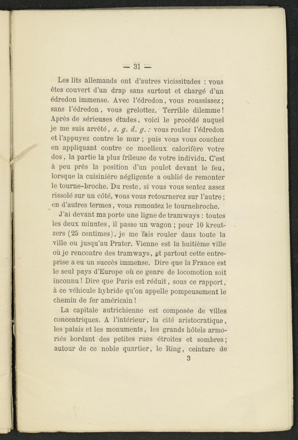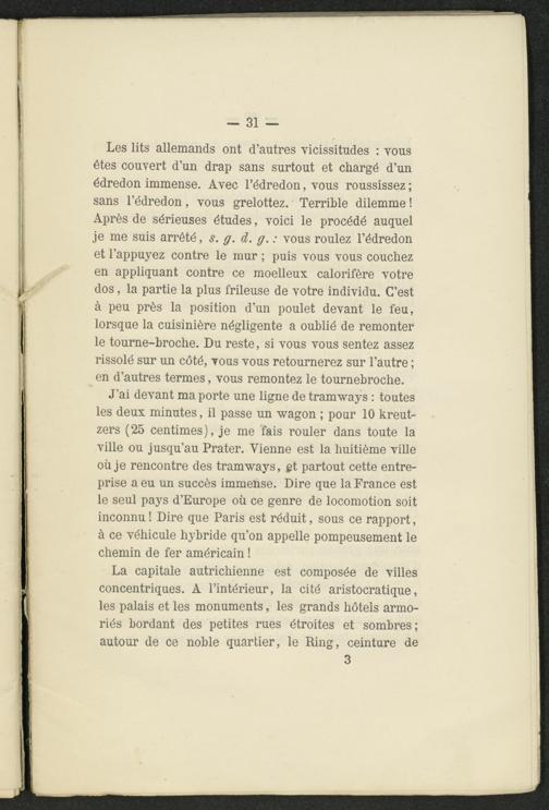 J’ai devant ma porte une ligne de tramways : toutes les deux minutes, il passe un wagon ; pour 10 kreut- zers (25 centimes), je me fais rouler dans toute la ville ou jusqu’au Prater. Vienne est la huitième ville où je rencontre des tramways, gt partout cette entreprise a eu un succès immeùse. Dire que la France est le seul pays d’Europe où ce genre de locomotion soit inconnu ! Dire que Paris est réduit, sous ce rapport, à ce véhicule hybride qu’on appelle pompeusement le chemin de fer américain !