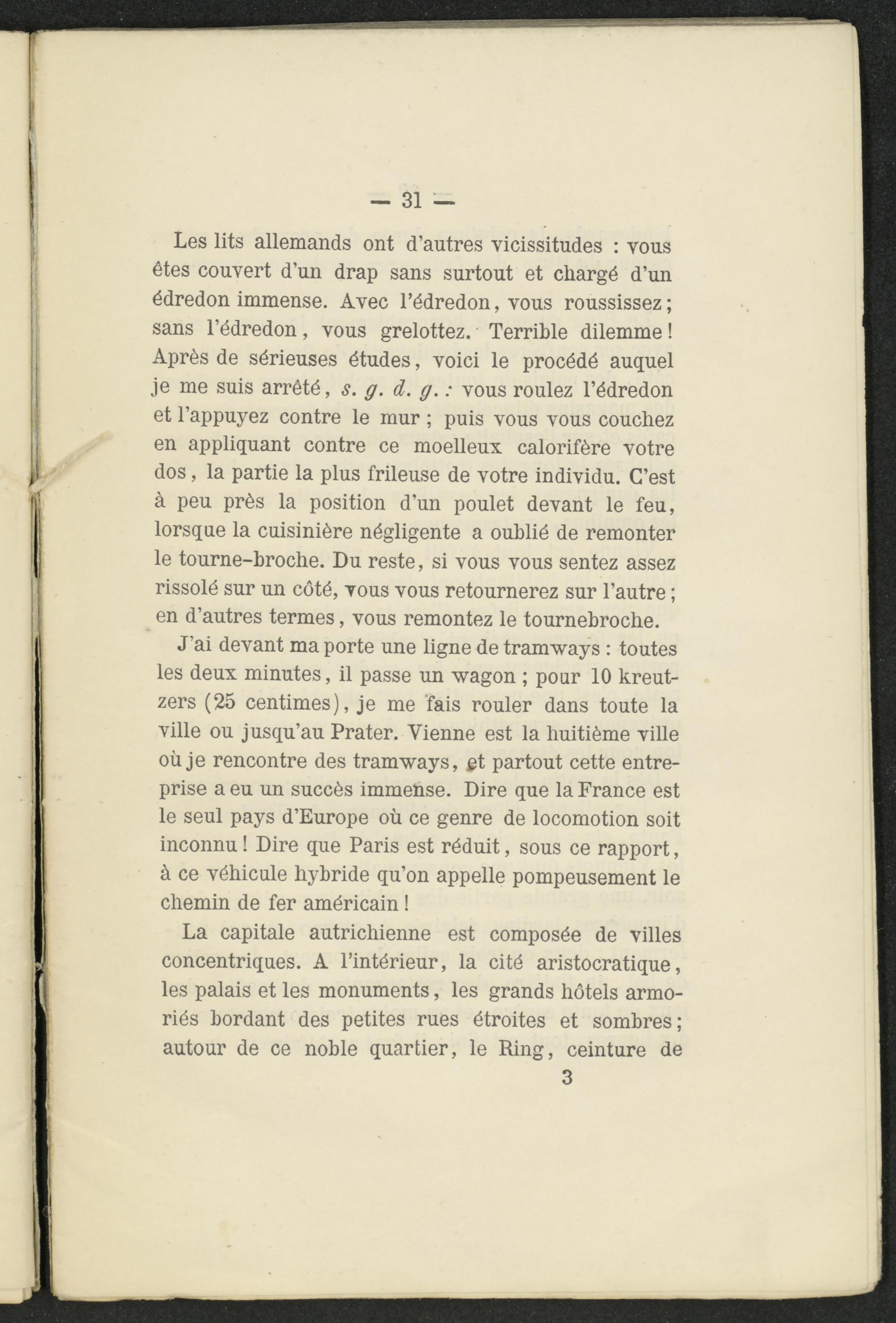 Les lits allemands ont d’autres vicissitudes : vous êtes couvert d’un drap sans surtout et chargé d’un édredon immense. Avec l’édredon, vous roussissez ; sans l’édredon, vous grelottez. Terrible dilemme ! Après de sérieuses études, voici le procédé auquel je me suis arrêté, s. g. d. g. : vous roulez l’édredon et l’appuyez contre le mur ; puis vous vous couchez en appliquant contre ce moelleux calorifère votre dos, la partie la plus frileuse de votre individu. C’est à peu près la position d’un poulet devant le feu, lorsque la cuisinière négligente a oublié de remonter le tourne-broche. Du reste, si vous vous sentez assez rissolé sur un côté, vous vous retournerez sur l’autre ; en d’autres termes, vous remontez le tournebroche.