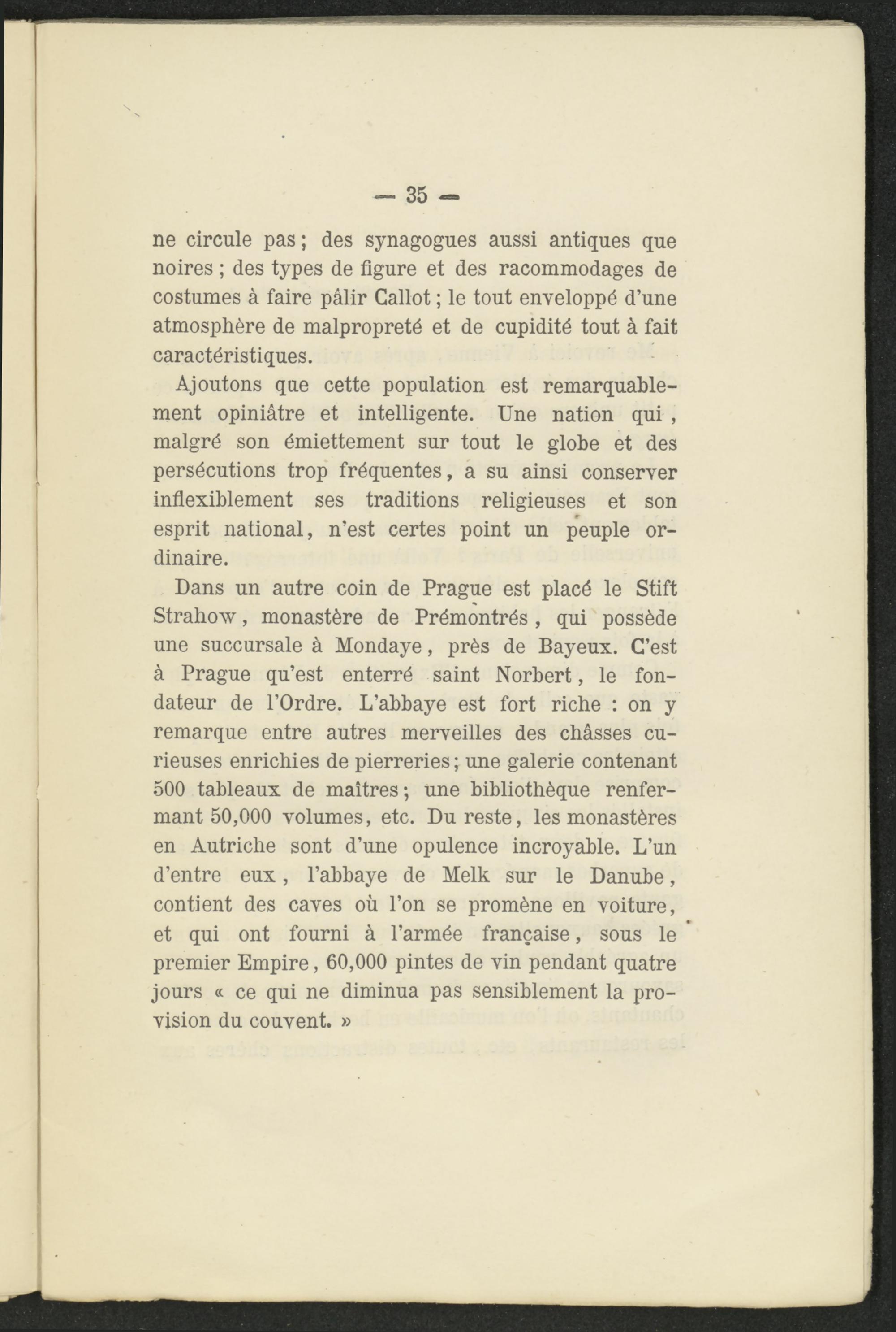 Dans un autre coin de Prague est placé le Stift Strahow, monastère de Prémontrés, qui possède une succursale à Mondaye, près de Bayeux. C’est à Prague qu’est enterré saint Norbert, le fondateur de l’Ordre. L’abbaye est fort riche : on y remarque entre autres merveilles des châsses curieuses enrichies de pierreries ; une galerie contenant 500 tableaux de maîtres; une bibliothèque renfermant 50,000 volumes, etc. Du reste, les monastères en Autriche sont d’une opulence incroyable. L’un d’entre eux, l’abbaye de Melk sur le Danube, contient des caves où l’on se promène en voiture, et qui ont fourni à l’armée française, sous le premier Empire, 60,000 pintes de vin pendant quatre jours « ce qui ne diminua pas sensiblement la provision du couvent. »