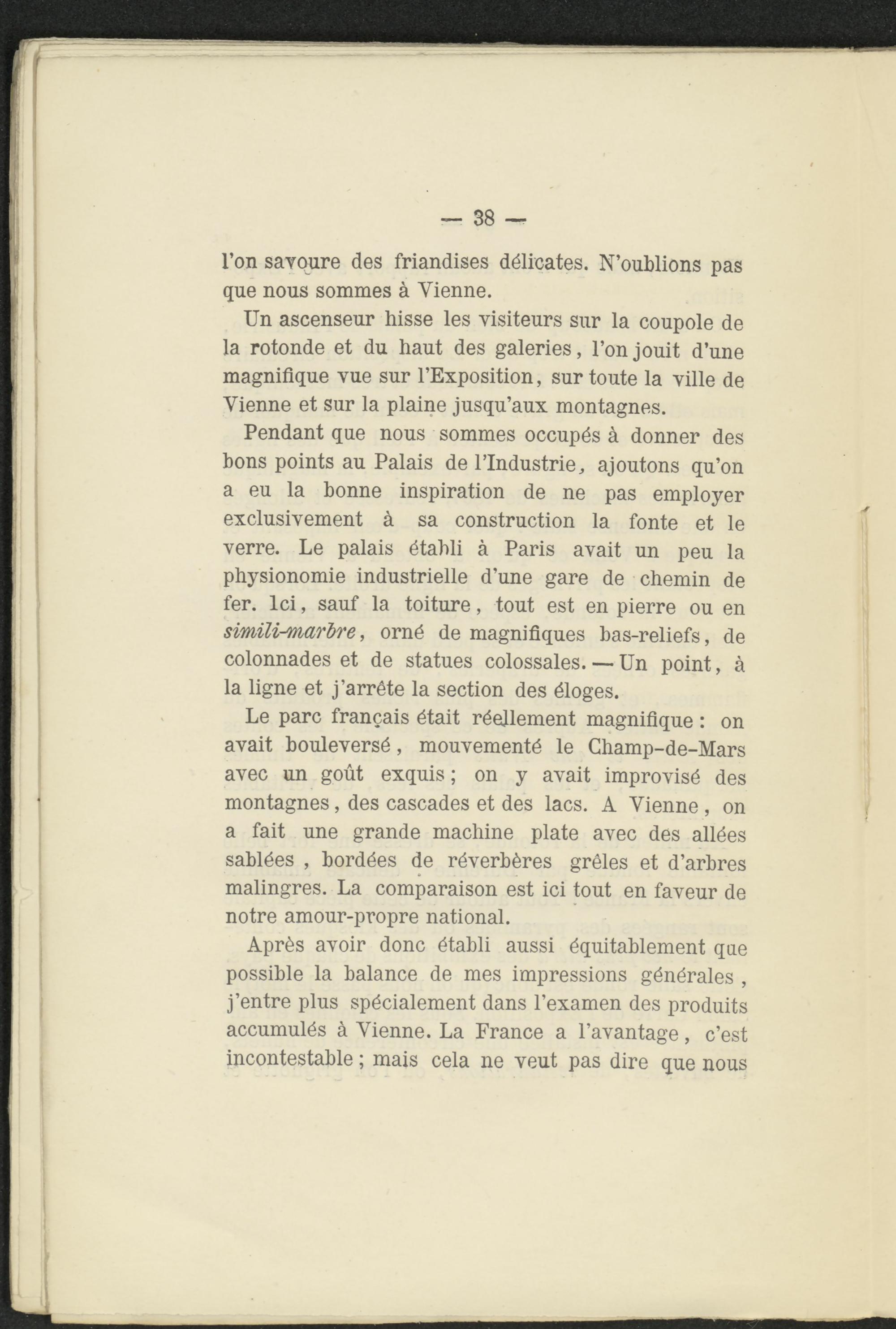 Après avoir donc établi aussi équitablement que possible la balance de mes impressions générales , j’entre plus spécialement dans l’examen des produits accumulés à Vienne. La France a l’avantage, c’est incontestable ; mais cela ne veut pas dire que nous