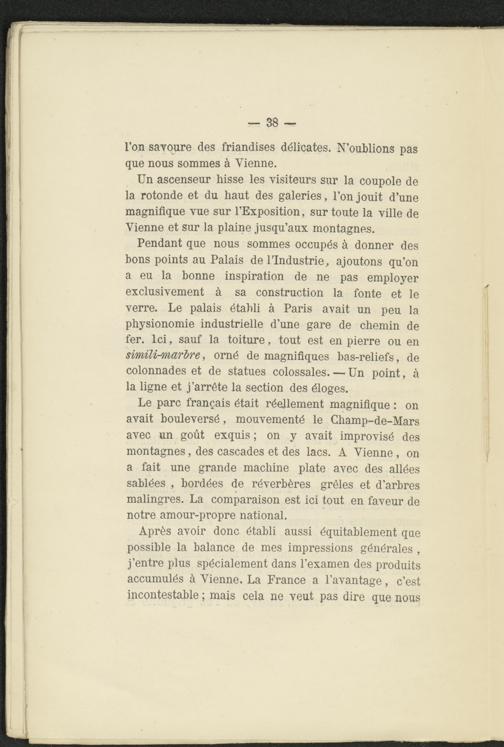 Le parc français était réellement magnifique : on avait bouleversé, mouvementé le Champ-de-Mars avec un goût exquis ; on y avait improvisé des montagnes, des cascades et des lacs. A Vienne, on a fait une grande machine plate avec des allées sablées , bordées de réverbères grêles et d’arbres malingres. La comparaison est ici tout en faveur de notre amour-propre national.
