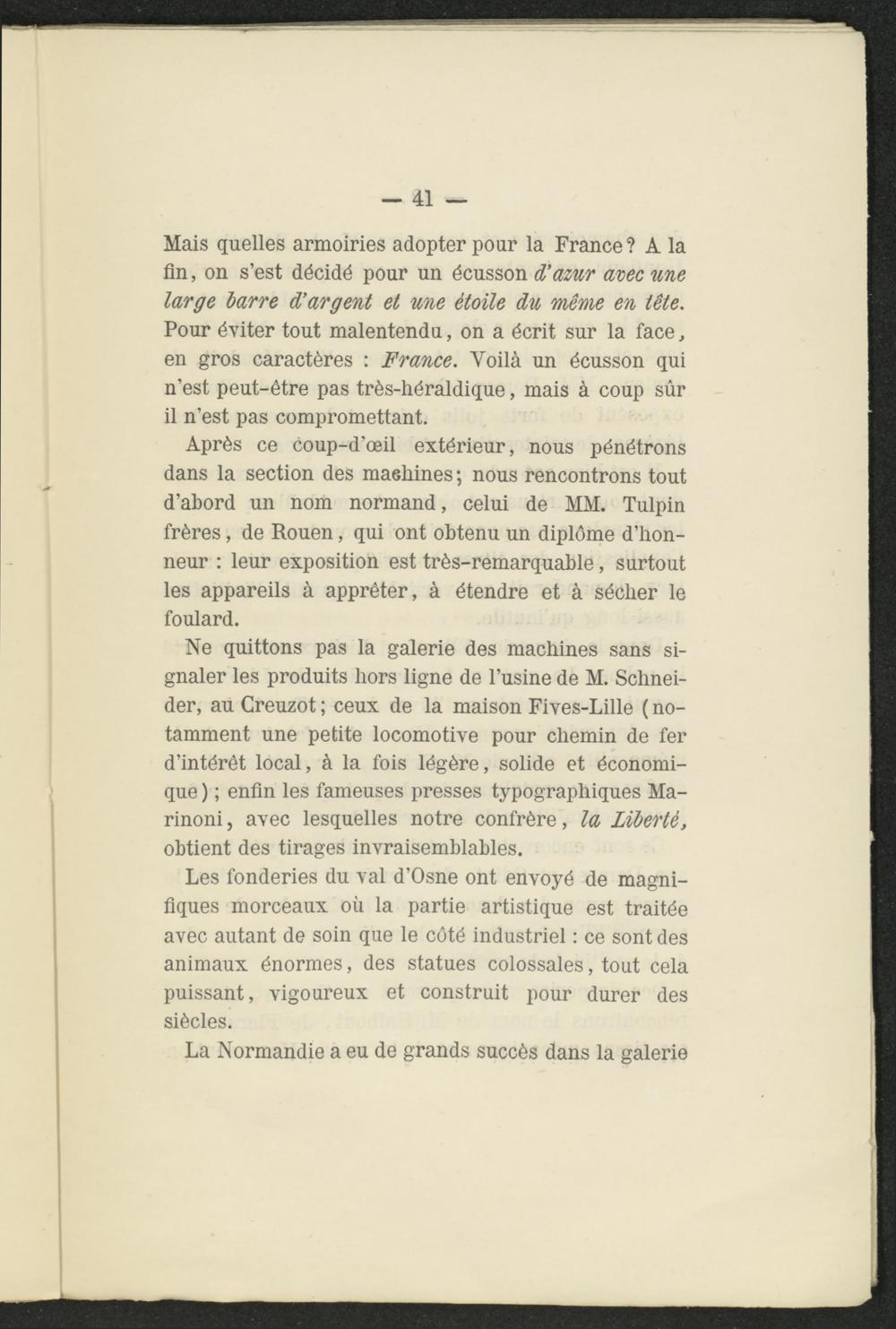 Après ce coup-d’œil extérieur, nous pénétrons dans la section des machines ; nous rencontrons tout d’abord un nom normand, celui de MM. Tulpin frères, de Rouen, qui ont obtenu un diplôme d’honneur : leur exposition est très-remarquable, surtout les appareils à apprêter, à étendre et à sécher le foulard.