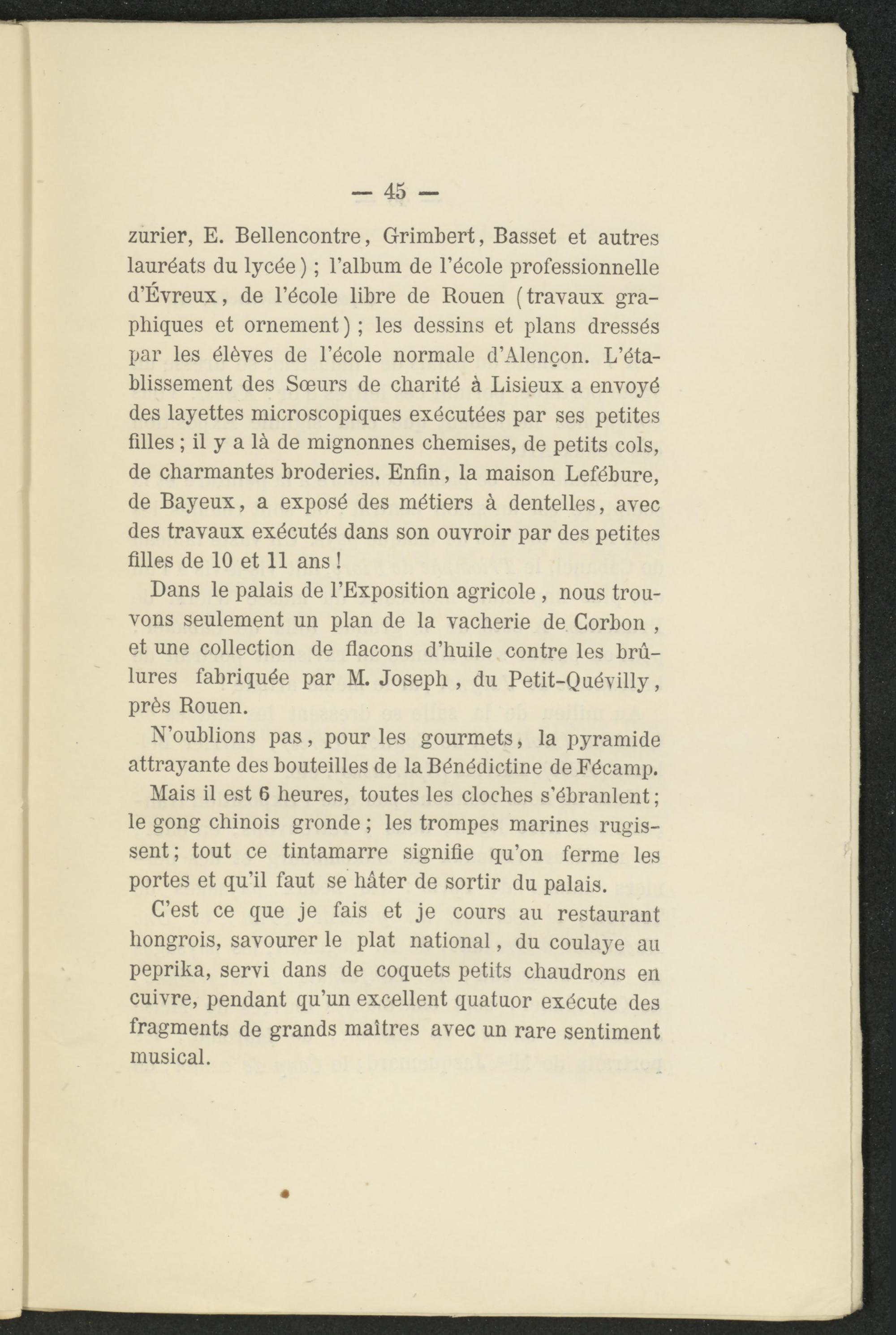 zurier, E. Bellencontre, Grimbert, Basset et autres lauréats du lycée ) ; l’album de l’école professionnelle d’Évreux, de l’école libre de Rouen (travaux graphiques et ornement ) ; les dessins et plans dressés par les élèves de l’école normale d’Alençon. L’établissement des Sœurs de charité à Lisieux a envoyé des layettes microscopiques exécutées par ses petites filles ; il y a là de mignonnes chemises, de petits cols, de charmantes broderies. Enfin, la maison Lefébure, de Bayeux, a exposé des métiers à dentelles, avec des travaux exécutés dans son ouvroir par des petites filles de 10 et 11 ans !
