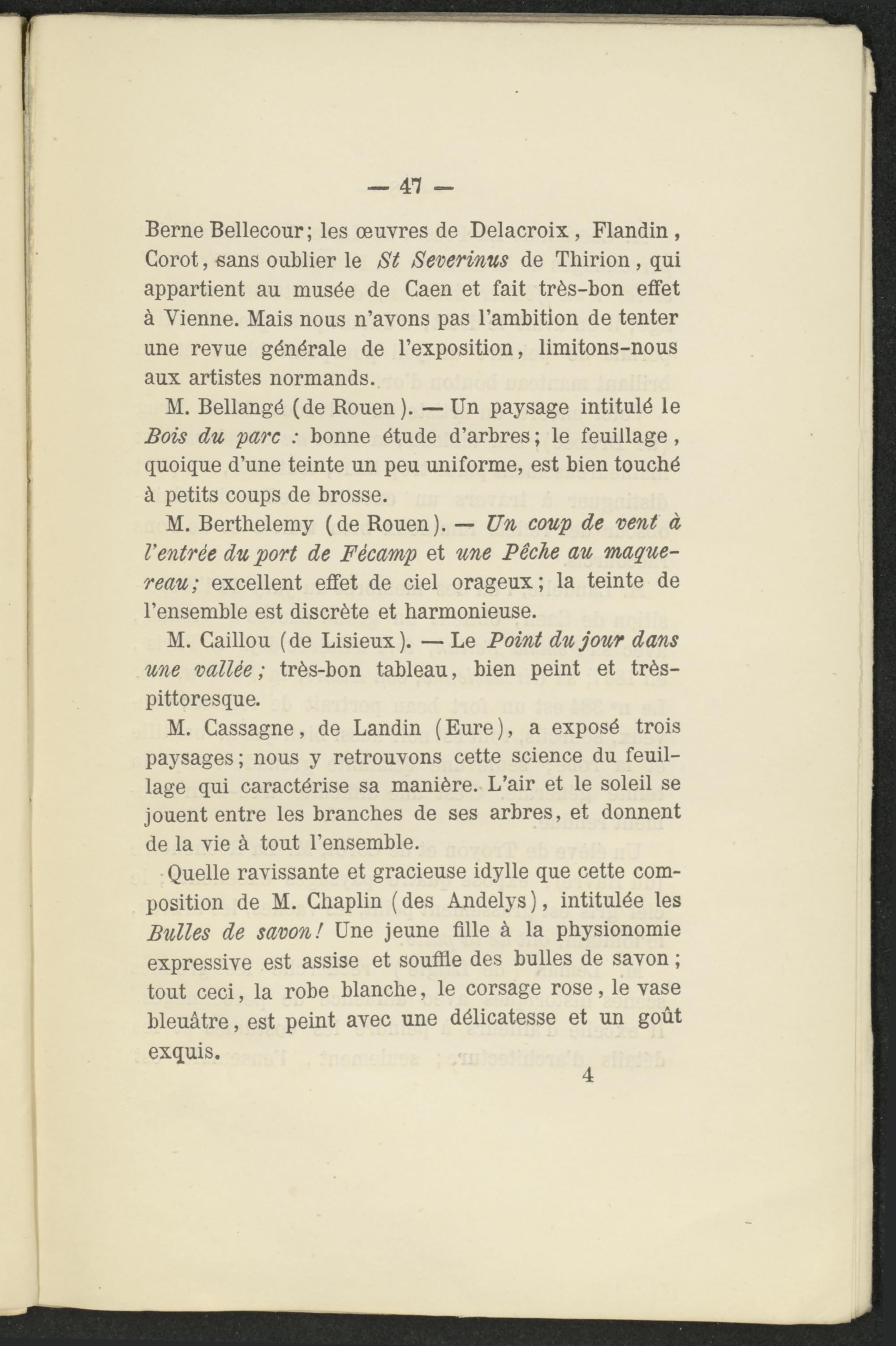 Berne Bellecour; les œuvres de Delacroix, Flandin , Corot, sans oublier le St Severinus de Thirion, qui appartient au musée de Caen et fait très-bon effet à Vienne. Mais nous n’avons pas l’ambition de tenter une revue générale de l’exposition, limitons-nous aux artistes normands.