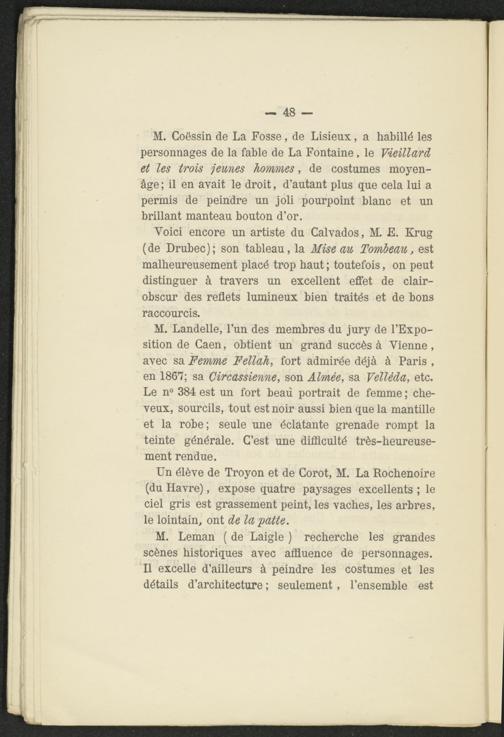 Voici encore un artiste du Calvados, M. E. Krug (de Drubec); son tableau, la Mise au Tombeau, est malheureusement placé trop haut ; toutefois, on peut distinguer à travers un excellent effet de clair- obscur des reflets lumineux bien traités et de bons raccourcis.