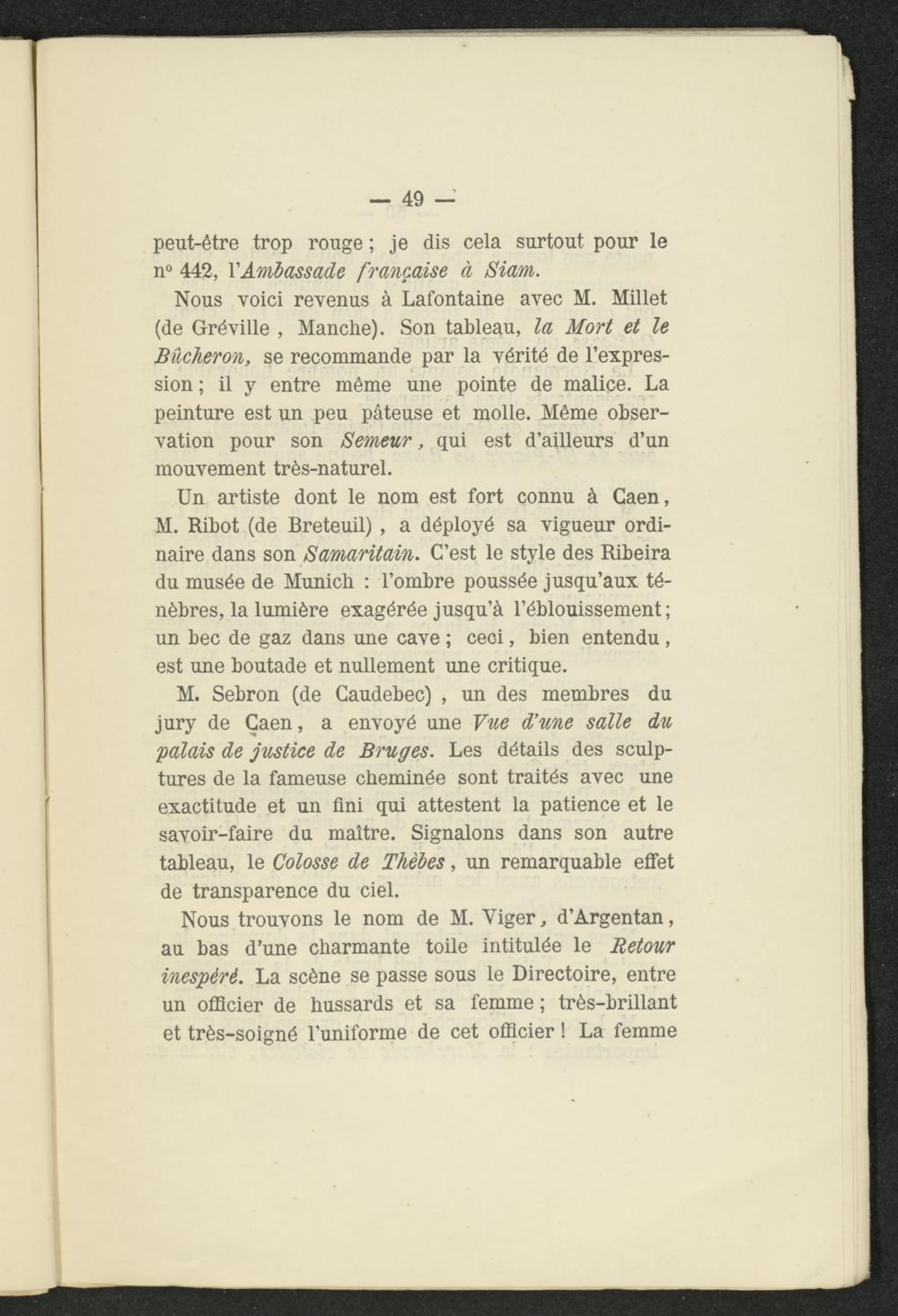 Un artiste dont le nom est fort connu à Caen, M. Ribot (de Breteuil) , a déployé sa vigueur ordinaire dans son Samaritain. C’est le style des Ribeira du musée de Munich : l’ombre poussée jusqu’aux ténèbres, la lumière exagérée jusqu’à l’éblouissement; un bec de gaz dans une cave ; ceci, bien entendu , est une boutade et nullement une critique.