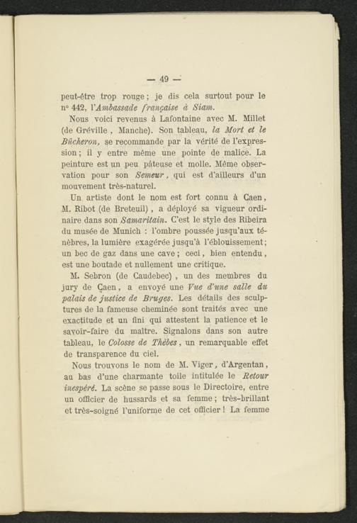 Nous voici revenus à Lafontaine avec M. Millet (de Gréville , Manche). Son tableau, la Mort et le Bûcheron, se recommande par la vérité de l’expression ; il y entre même une pointe de malice. La peinture est un peu pâteuse et molle. Même observation pour son Semeur, qui est d’ailleurs d’un mouvement très-naturel.