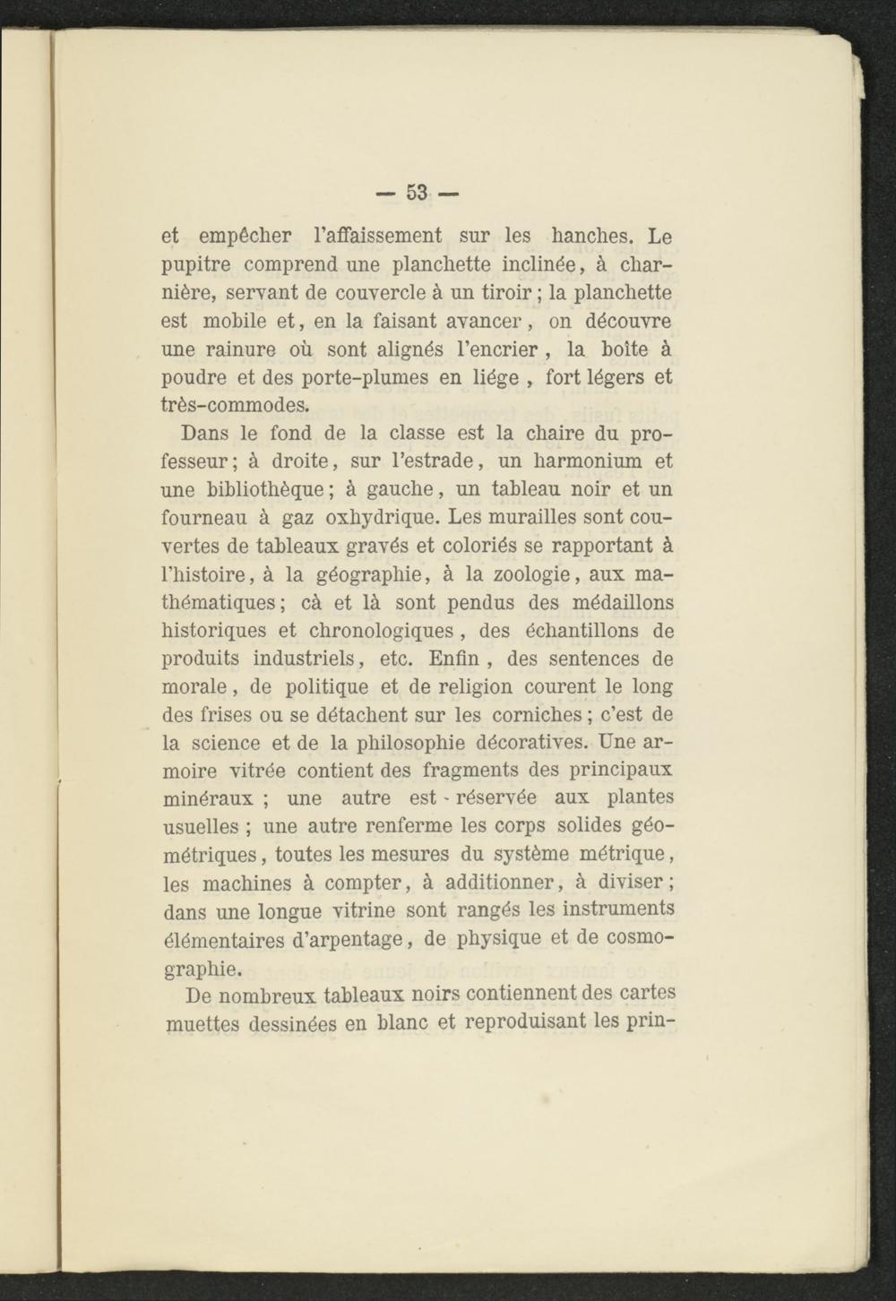 Dans le fond de la classe est la chaire du professeur; à droite, sur l’estrade, un harmonium et une bibliothèque ; à gauche, un tableau noir et un fourneau à gaz oxhydrique. Les murailles sont couvertes de tableaux gravés et coloriés se rapportant à l’histoire, à la géographie, à la zoologie, aux mathématiques; cà et là sont pendus des médaillons historiques et chronologiques , des échantillons de produits industriels, etc. Enfin , des sentences de morale, de politique et de religion courent le long des frises ou se détachent sur les corniches ; c’est de la science et de la philosophie décoratives. Une armoire vitrée contient des fragments des principaux minéraux ; une autre est - réservée aux plantes usuelles ; une autre renferme les corps solides géométriques , toutes les mesures du système métrique, les machines à compter, à additionner, à diviser ; dans une longue vitrine sont rangés les instruments élémentaires d’arpentage, de physique et de cosmographie.