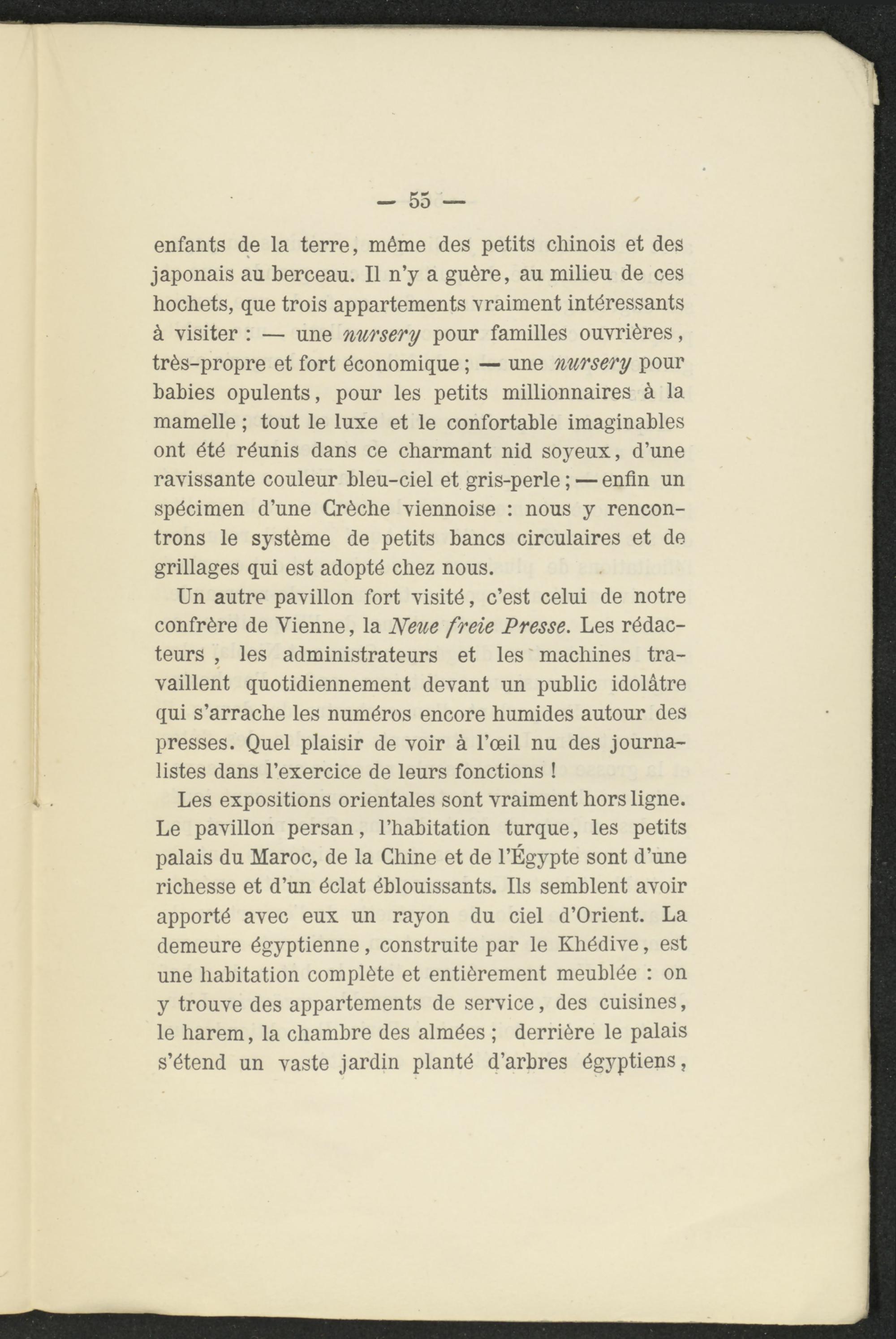 Un autre pavillon fort visité, c’est celui de notre confrère de Vienne, la Neue freie Presse. Les rédacteurs , les administrateurs et les machines travaillent quotidiennement devant un public idolâtre qui s’arrache les numéros encore humides autour des presses. Quel plaisir de voir à l’œil nu des journalistes dans l’exercice de leurs fonctions !