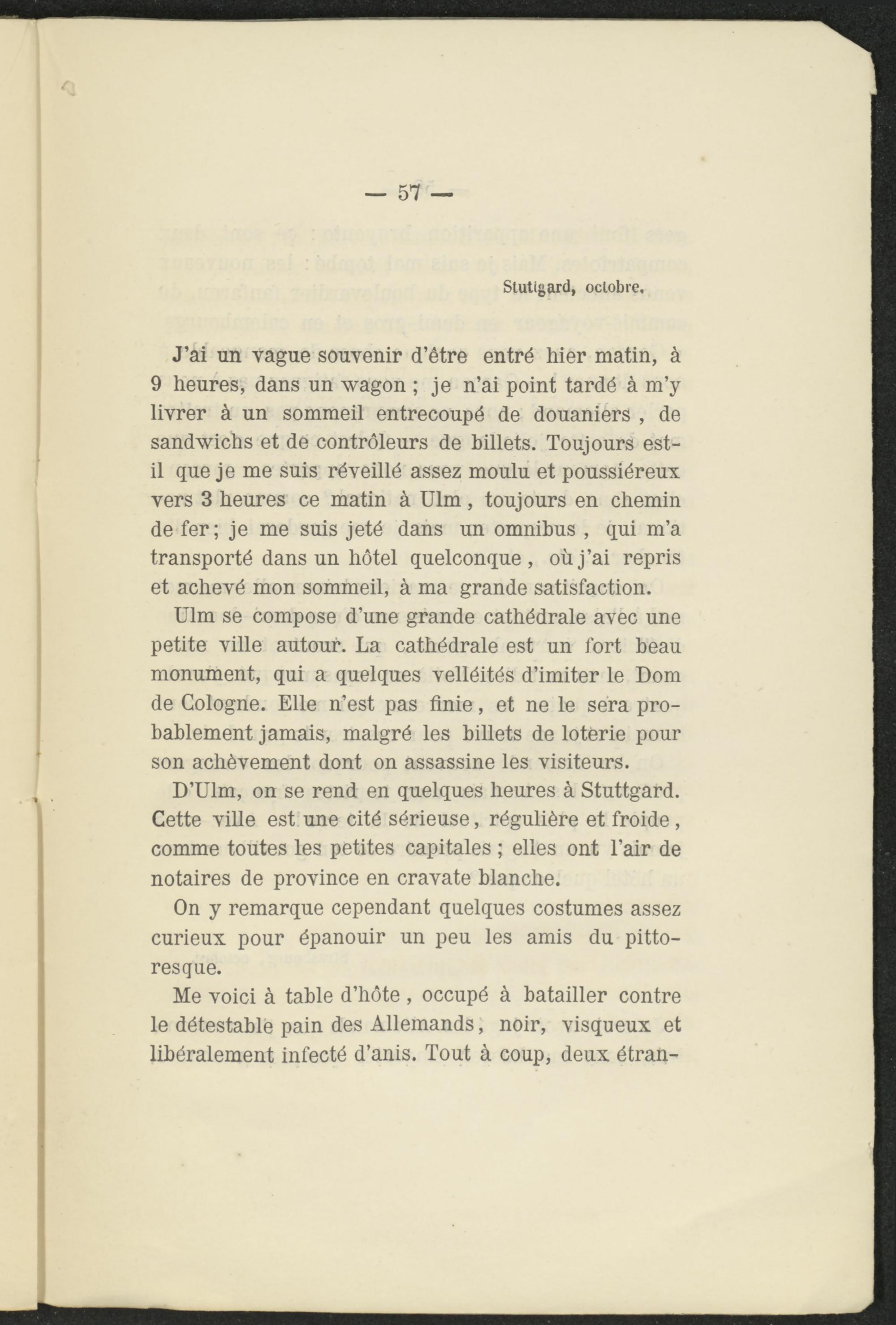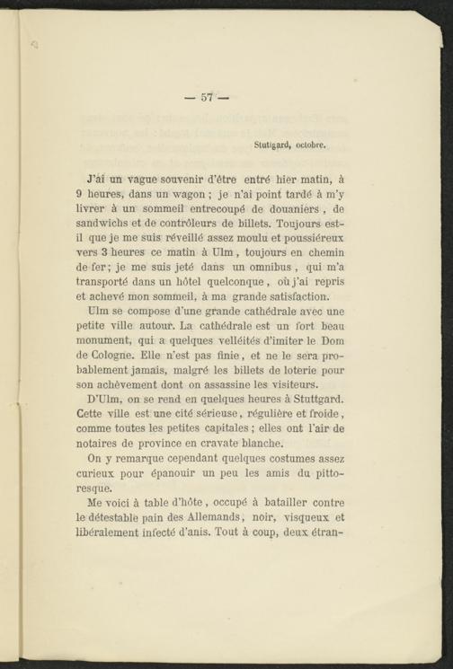 Me voici à table d’hôte , occupé à batailler contre le détestable pain des Allemands, noir, visqueux et libéralement infecté d’anis. Tout à coup, deux étran-