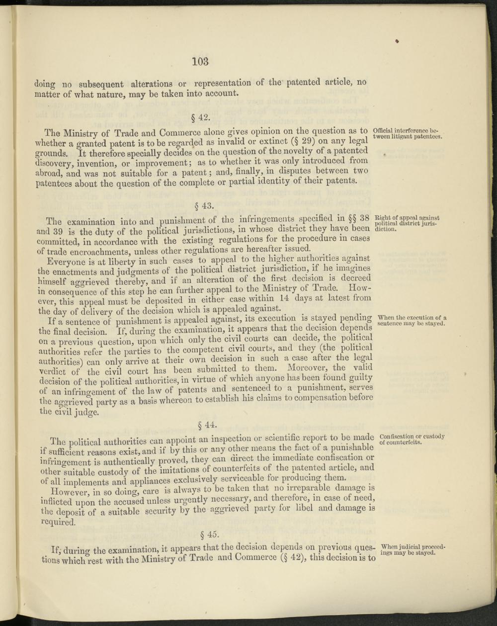 The Ministry of Trade and Commerce alone gives opinion on the question as to ^y t n >^™tees. whether a granted patent is to be regarded as invalid or extinct (§ 29) on any legal grounds. It therefore specially decides on the question of the novelty of a patented discovery, invention, or improvement; as to whether it was only introduced from abroad, and was not suitable for a patent; and, finally, in disputes between two patentees about the question of the complete or partial identity of their patents.