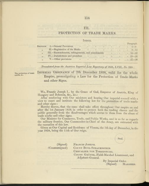 The protection of trade Imperial Ordinance of 7th December 1858, valid for tlie wliole marks ’ & ( c ’ ' Empire, promulgating a Law for the Protection of Trade Marks