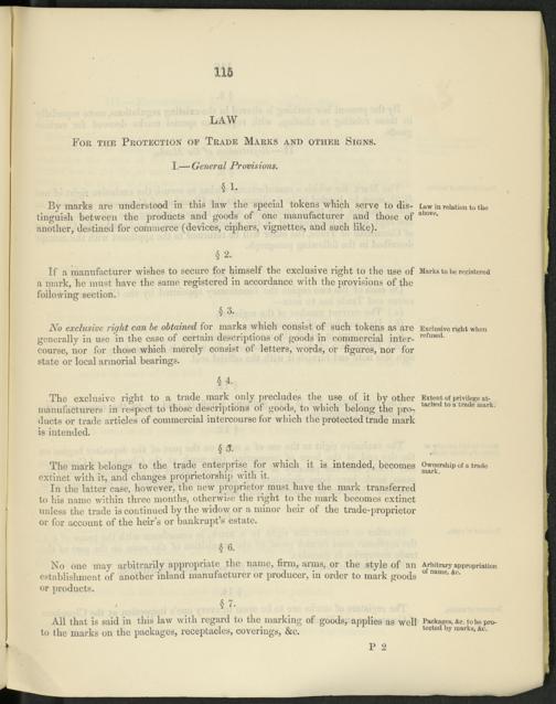 By marks are understood in this law the special tokens which serve to distinguish between the products and goods of one manufacturer and those of another, destined for commerce (devices, ciphers, vignettes, and such like).