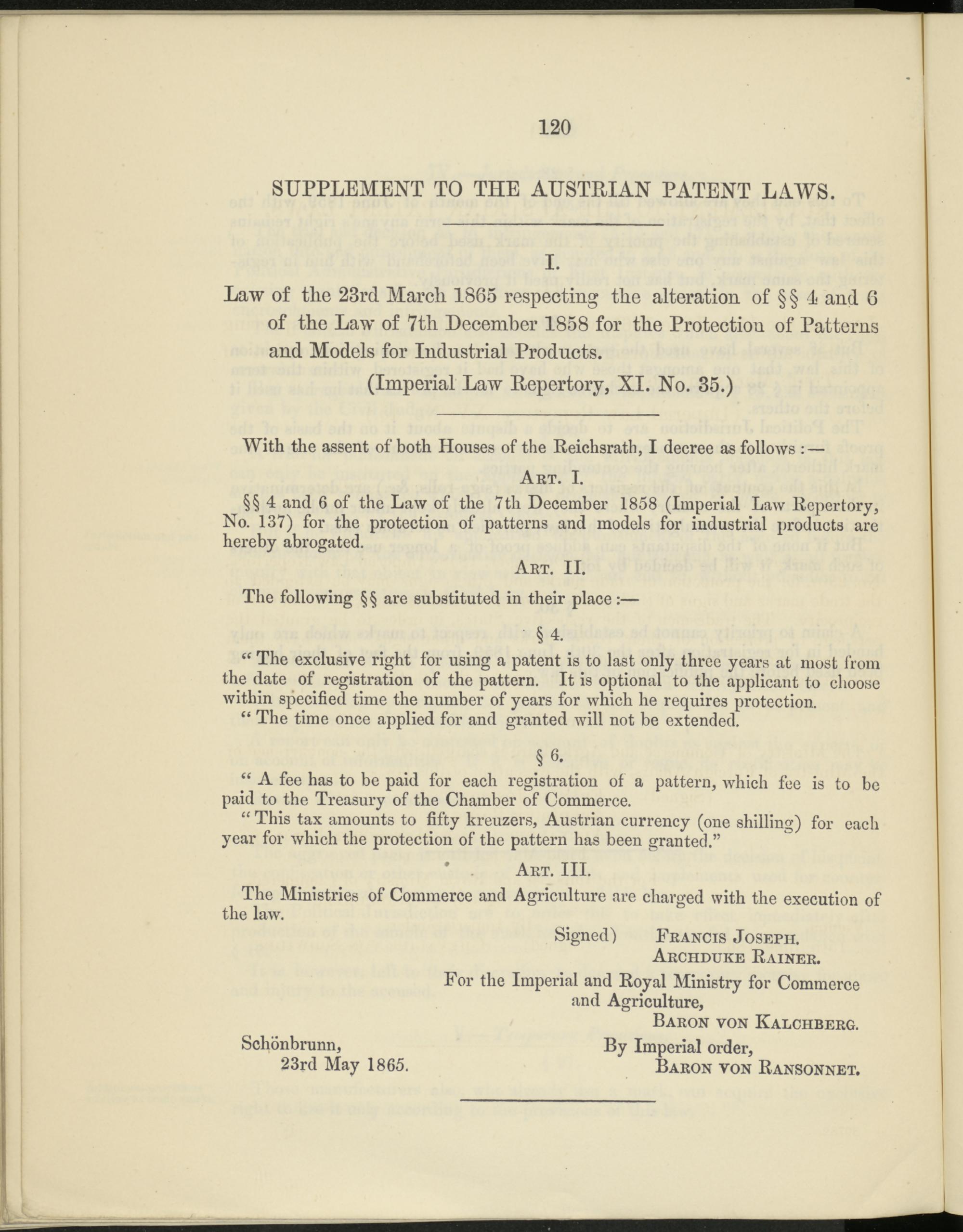 Law of the 23rd March 1865 respecting the alteration of § § 1 and 6 of the Law of 7th December 1858 for the Protection of Patterns and Models for Industrial Products.