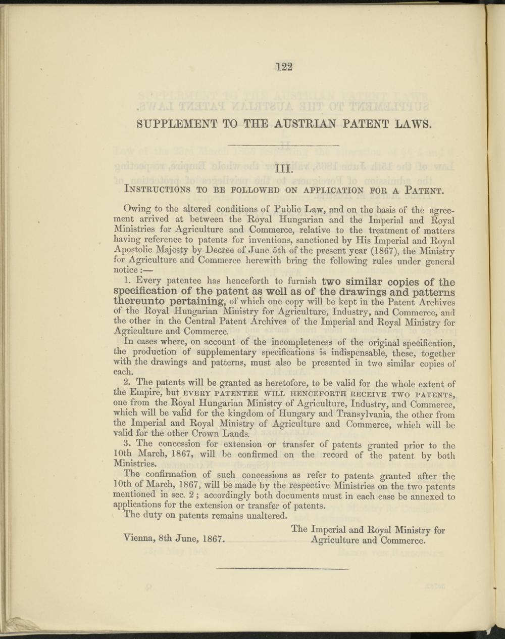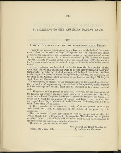 Owing to the altered conditions of Public Law, and on the basis of the agreement arrived at between the Royal Hungarian and the Imperial and Royal Ministries for Agriculture and Commerce, relative to the treatment of matters having reference to patents for inventions, sanctioned by His Imperial and Royal Apostolic Majesty by Decree of June 5th of the present year (1867), the Ministry for Agriculture and Commerce herewith bring the following rules under general notice:—