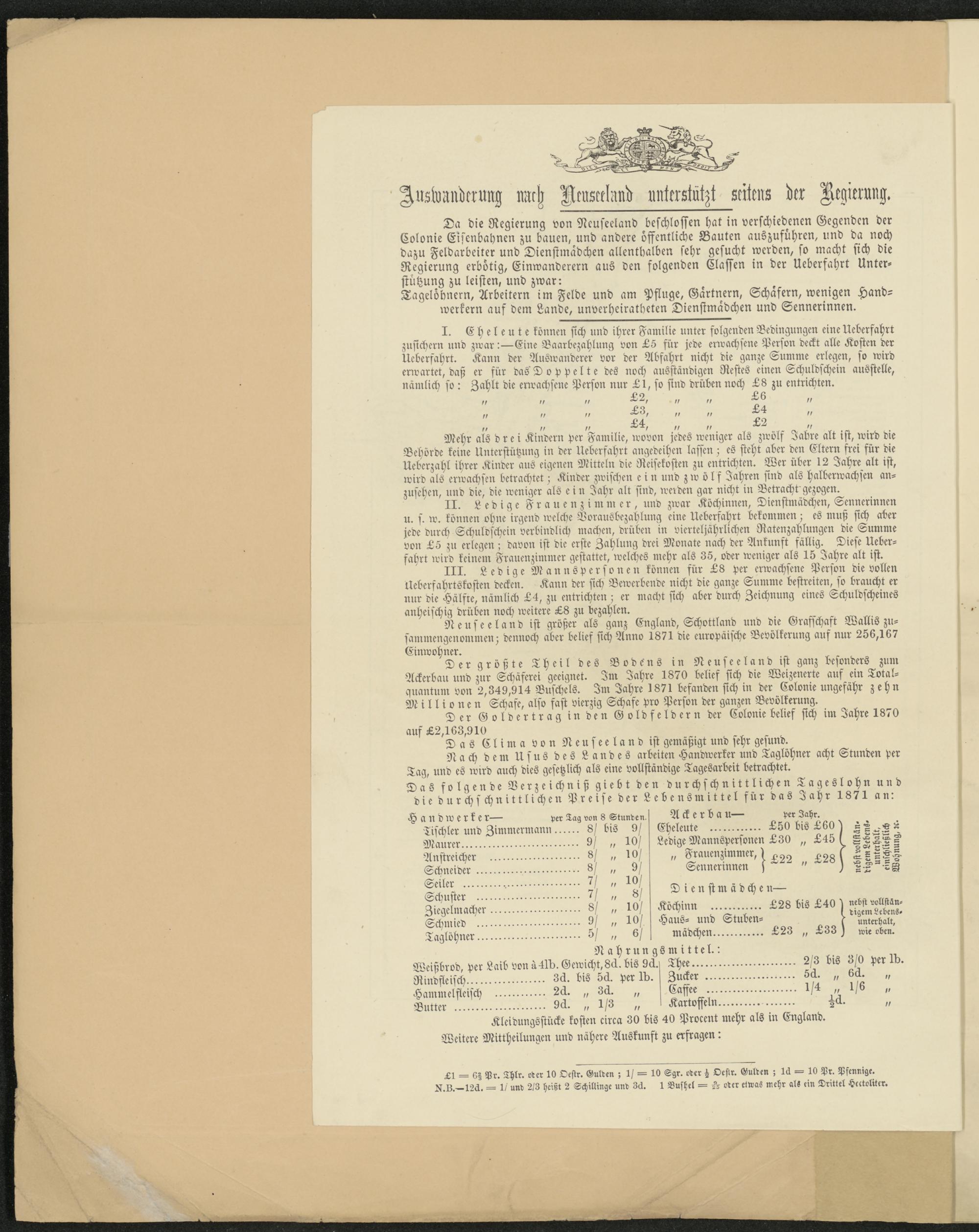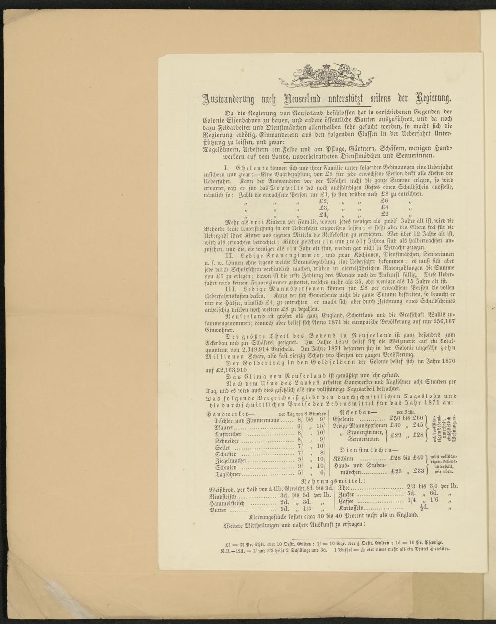 Da die Regierung von Neuseeland beschlossen hat in verschiedenen Gegenden der Colonie Eisenbahnen zu bauen, und andere öffentliche Bauten auszuführen, und da noch dazu Feldarbeiter und Dienstmädchen allenthalben sehr gesucht werden, so macht sich die Regierung erbötig, Einwanderern aus den folgenden Classen in der Ueberfahrt Unterstützung zu leisten, und zwar: