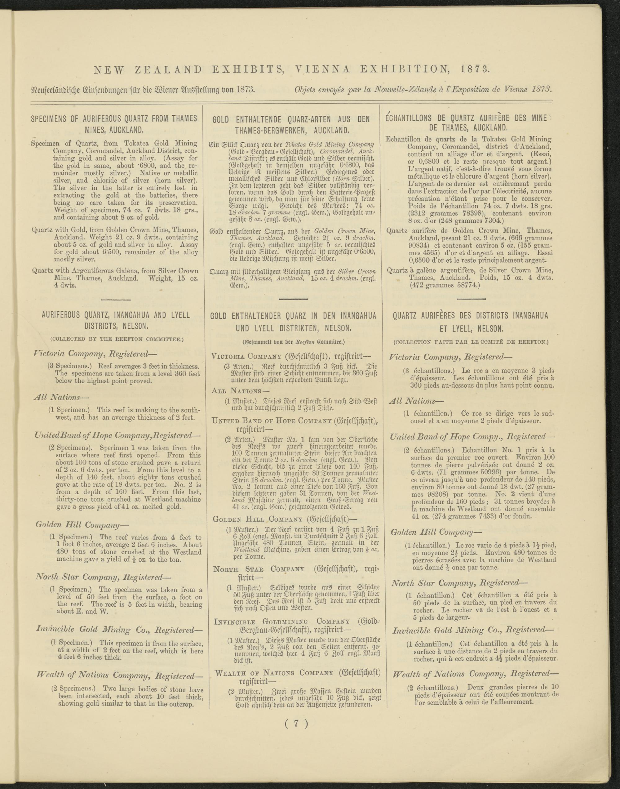 (1 Muster.) Der Reef variirt von 4 Fuß zu 1 Fuß 6 Zoll (engl. Maaß), im Durchschnitt 2 Fuß 6 Zoll. Ungefähr 480 Tonnen Stem, zermalt in der Maschine, gaben einen Ertrag von 4 02 . per Tonne.