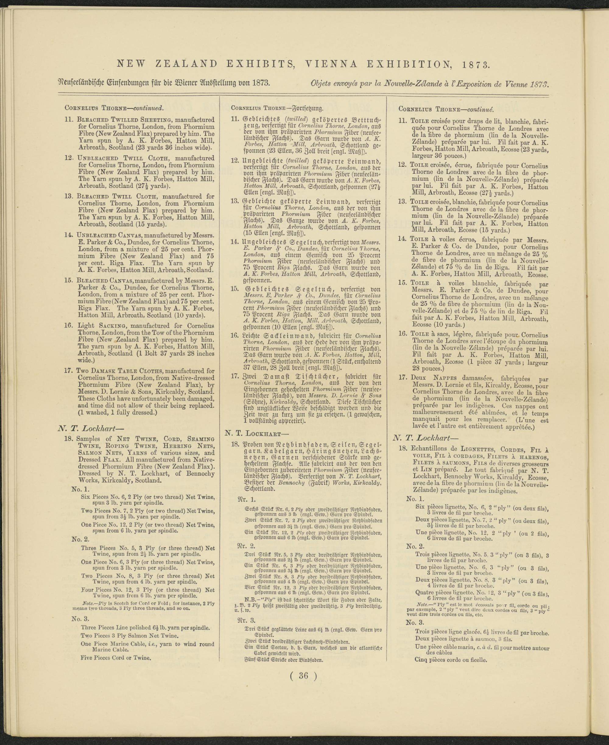 eug, verfertigt für t7orne^'ns 7^or»e, 7^o>rc7o-r, aus er von ihm präparirten TAorMrrE Fiber (neuseeländischer Flachs). Das Garn wurde von L 7^07'öes, 7^atto-r 0/r/^, Schottland ge