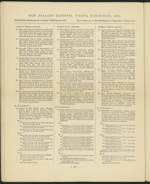 12. Ungebleichte (^wMe^) geköperte Leinwand, verfertigt für LornsUns r^onre, I,o»rckon, aus der von ihm präparirten ^km-rmkum, Fiber (neuseeländischer Flachs). Das Garn wurde von ll.X. Korbes, Xatton Lkkrr, ^»-bEkkr., Schottland, gesponnen (27^ Ellen sengl. Maß^j).