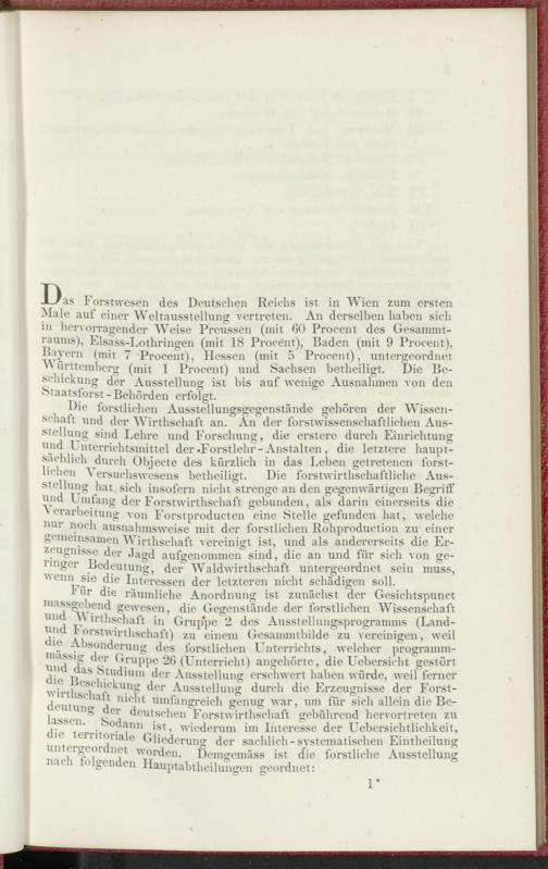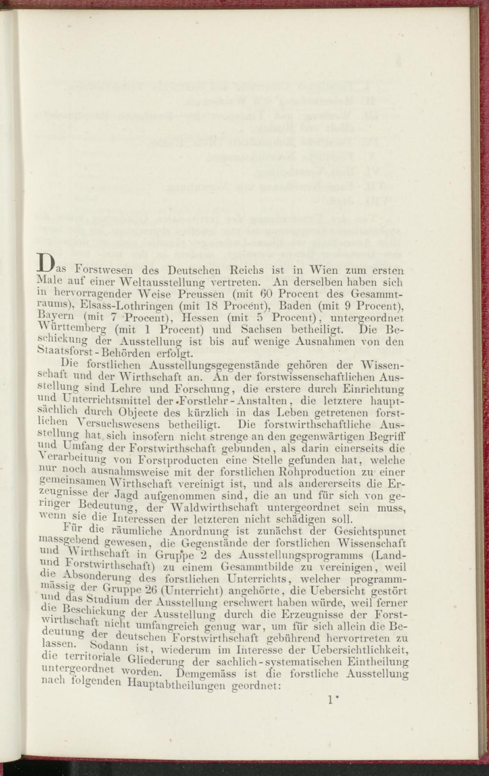 Das Forstwesen des Deutschen Reichs ist in Wien zum ersten Male auf einer Weltausstellung vertreten. An derselben haben sich in hervorragender Weise Preussen (mit 60 Procent des Gesammt- raums), Elsass-Lotliringen (mit 18 Procent), Baden (mit 9 Procent), Bayern (mit 7 Procent), Hessen (mit 5 Procent), untergeordnet W ürttemberg (mit 1 Procent) und Sachsen betheiligt. Die Beschickung der Ausstellung ist bis auf wenige Ausnahmen von den Staatslorst - Behörden erfolgt.