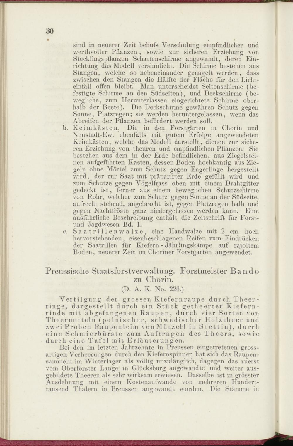b. Keimkästen. Die in den Forstgärten in Chorin und Neustadt-Ew. ebenfalls mit gutem Erfolge angewendeten Keimkästen, welche das Modell darstellt, dienen zur sicheren Erziehung von theuren und empfindlichen Pflanzen. Sie bestehen aus dem in der Erde befindlichen, aus Ziegelsteinen aufgeführten Kasten, dessen Boden hochkantig aus Ziegeln ohne Mörtel zum Schutz gegen Engerlinge hergestellt wird, der zur Saat mit präparirter Erde gefüllt wird und zum Schutze gegen Yögelfrass oben mit einem Drahtgitter gedeckt ist, ferner aus einem beweglichen Schutzschirme von Rohr, welcher zum Schutz gegen Sonne an der Südseite, aufrecht stehend, angebracht ist, gegen Platzregen halb und gegen Nachtfröste ganz niedergelassen werden kann. Eine ausführliche Beschreibung enthält die Zeitschrift für Forst- und Jagdwesen Bd. 1.