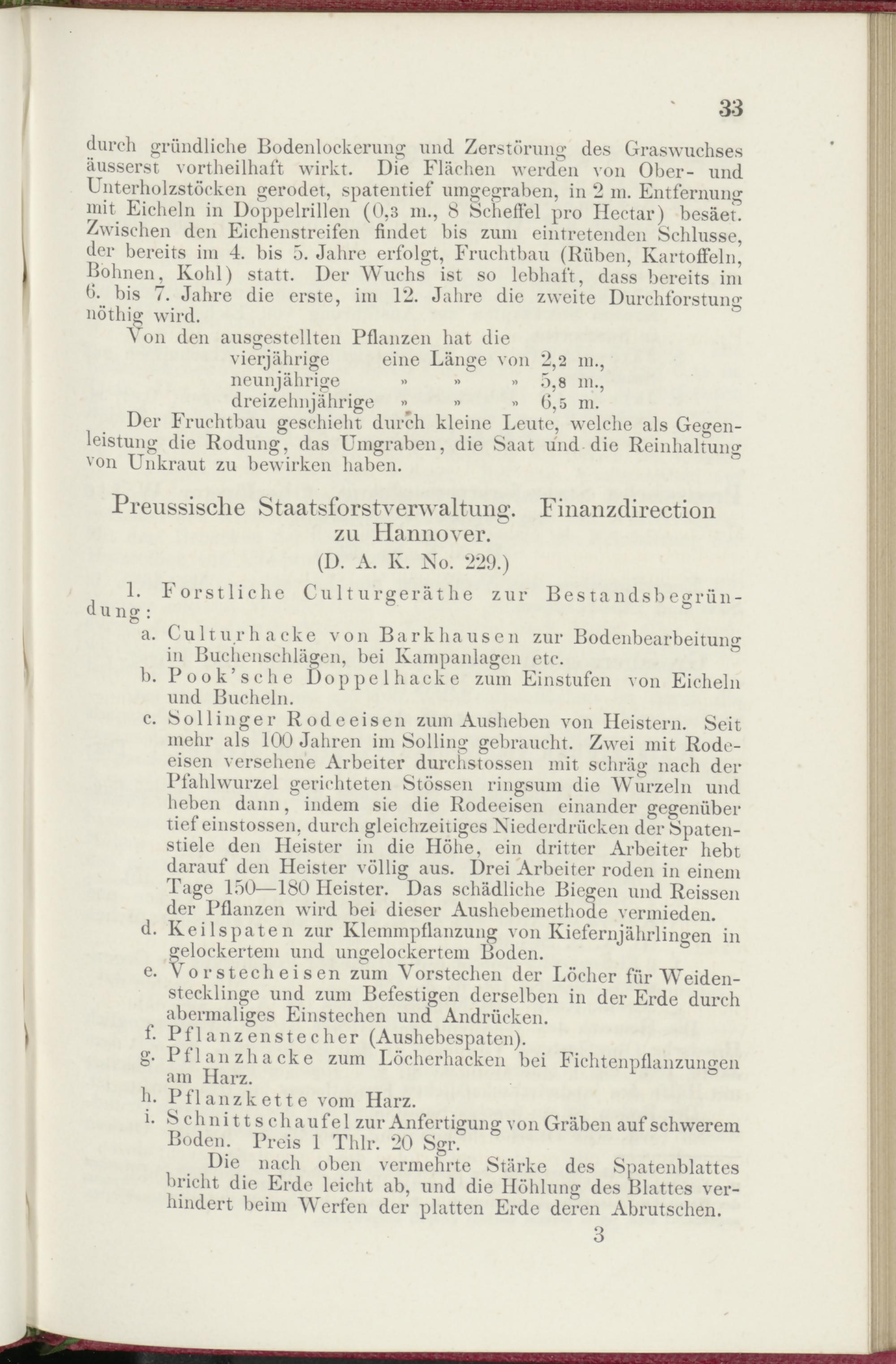 c. Sollinger Rodeeisen zum Ausheben von Heistern. Seit mehr als 100 Jahren im Solling gebraucht. Zwei mit Rodeeisen versehene Arbeiter durchstossen mit schräg nach der Pfahlwurzel gerichteten Stössen ringsum die Wurzeln und heben dann, indem sie die Rodeeisen einander gegenüber tief einstossen, durch gleichzeitiges Niederdrücken der Spatenstiele den Heister in die Höhe, ein dritter Arbeiter hebt darauf den Heister völlig aus. Drei Arbeiter roden in einem Tage 150—180 Heister. Das schädliche Biegen und Reissen der Pflanzen wird bei dieser Aushebemethoae vermieden.