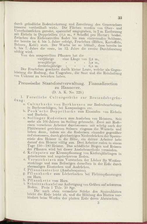 durch gründliche Bodenlockerung und Zerstörung des Graswuchses äusserst vortheilhaft wirkt. Die Flächen werden von Ober- und Unterholzstöcken gerodet, spatentief umgegraben, in 2 m. Entfernung mit Eicheln in Doppelrillen (0,3 in., 8 Scheffel pro Hectar) besäet. Zwischen den Eichenstreifen findet bis zum eintretenden Schlüsse, der bereits im 4. bis 5. Jahre erfolgt, Fruchtbau (Rüben, Kartoffeln, Bohnen, Kohl) statt. Der Wuchs ist so lebhaft, dass bereits im fi. bis 7. Jahre die erste, im 12. Jahre die zweite Durchforstung nöthig wird.