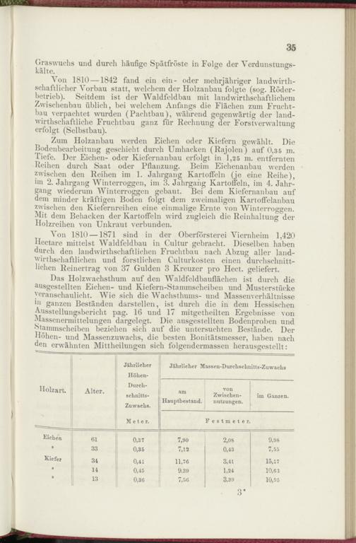 Von 1810 —1871 sind in der Oberförsterei Viernheim 1,420 Hectare mittelst Waldfeldbau in Cultur gebracht. Dieselben haben durch den landwirthschaftlichen Fruchtbau nach Abzug aller landwirtschaftlichen und forstlichen Culturkosten einen durchschnittlichen Reinertrag von 37 Gulden 3 Kreuzer pro Hect. geliefert.